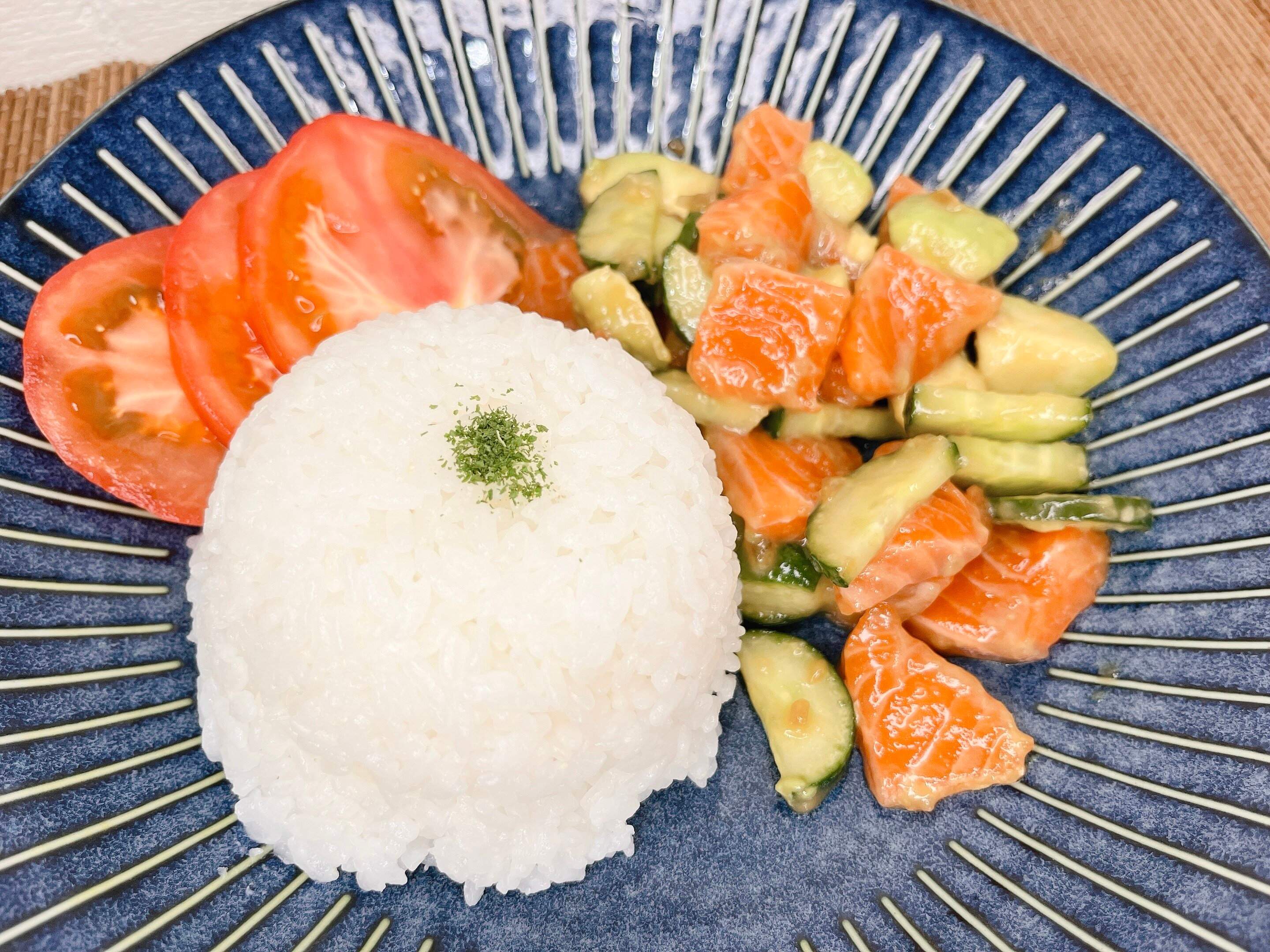 今回はサーモン、アボカド、きゅうりをあえました。