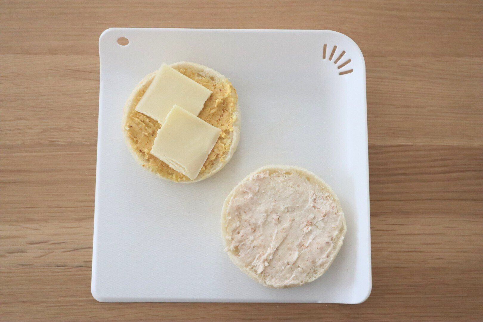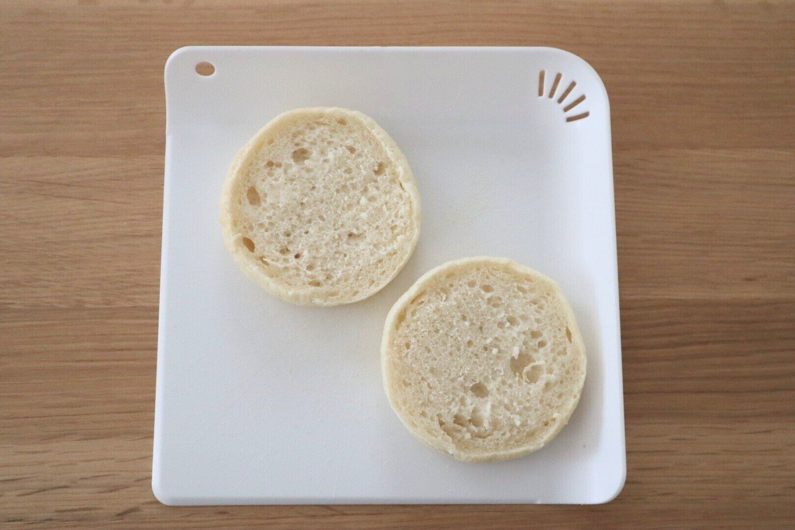 1. イングリッシュマフィンの切れ目に沿って、半分に切ります。