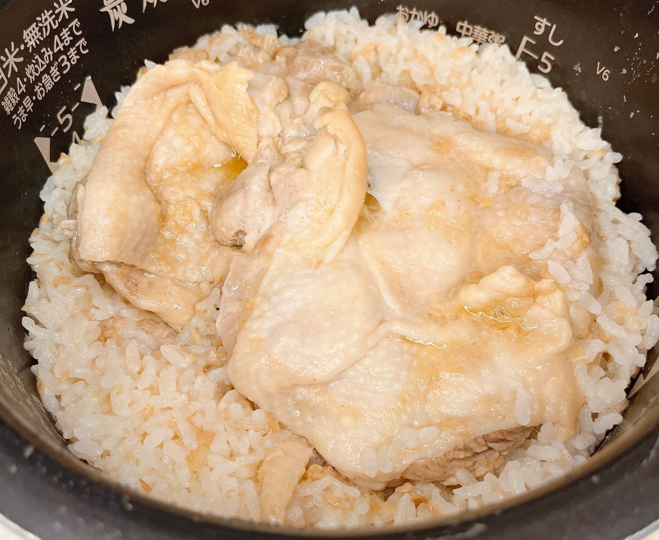 2.鶏もも肉1枚(約250~300g)をのせて炊飯します。