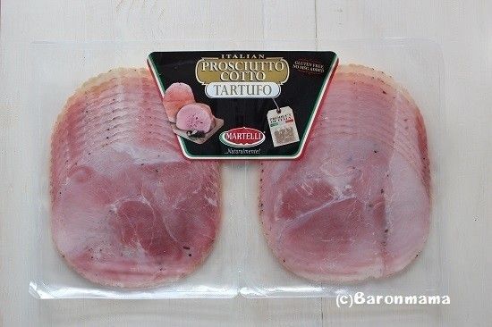 トリュフ入りハム の「プロシュートコット」はトリュフの香りがしておいしいハムです。そのまま盛り付けてオードブルの1品として使うのもよいですし、パンにはさんでもおいしくいただけます。