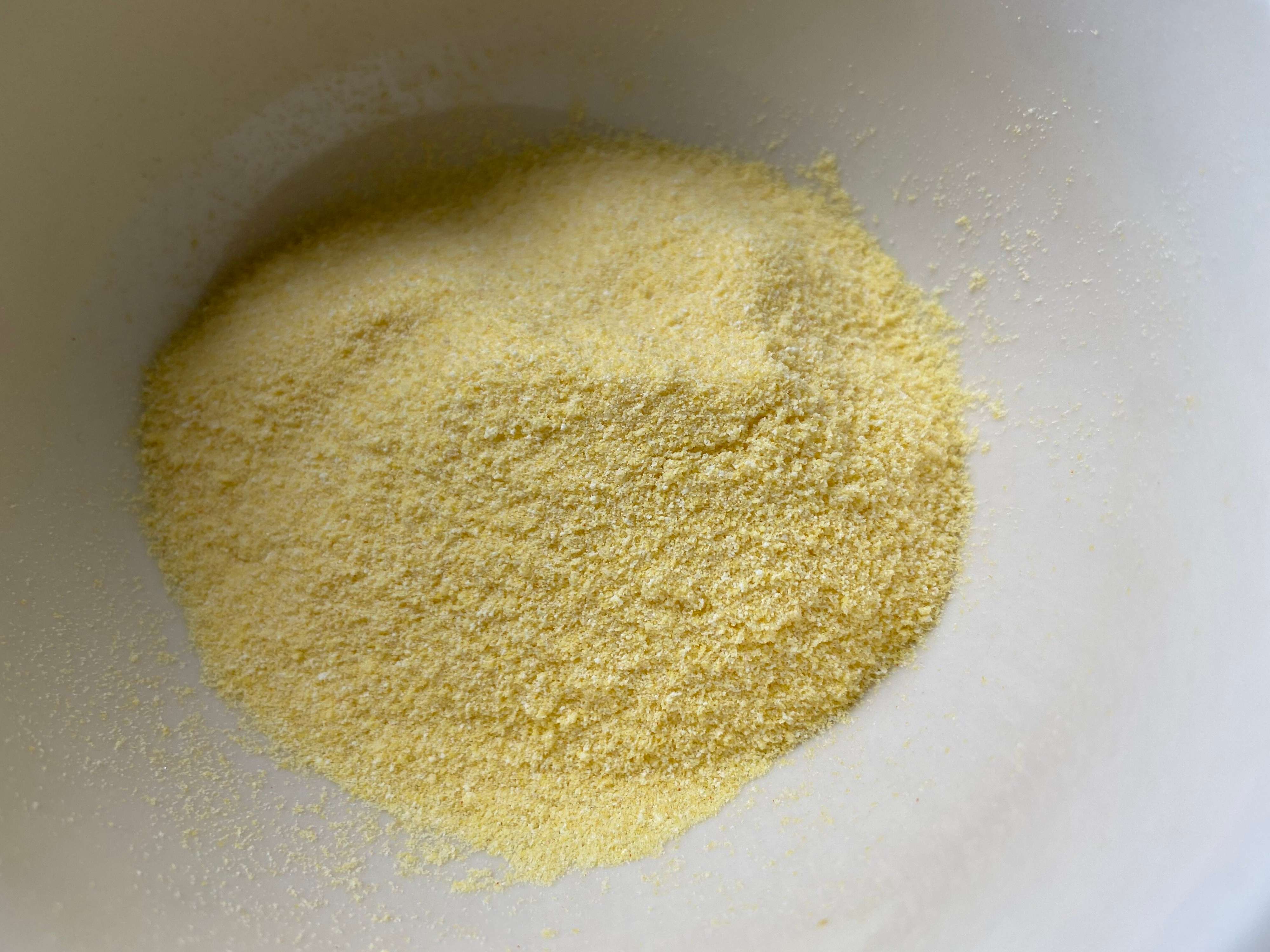 サラサラとしたコーンポタージュの粉末、ここに熱湯を注いでよく混ぜたら完成。