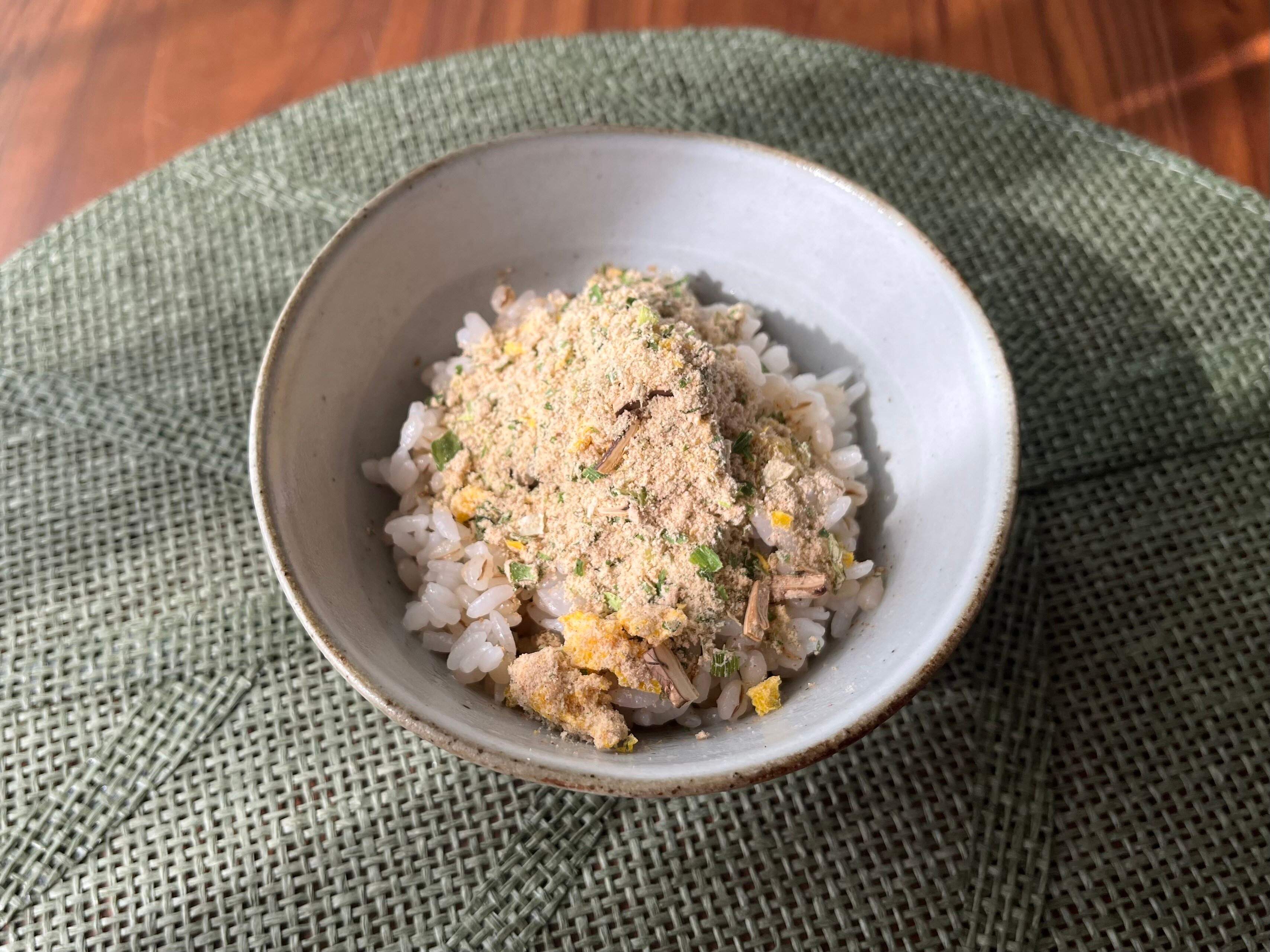 ここにお茶漬けの素をかけます。