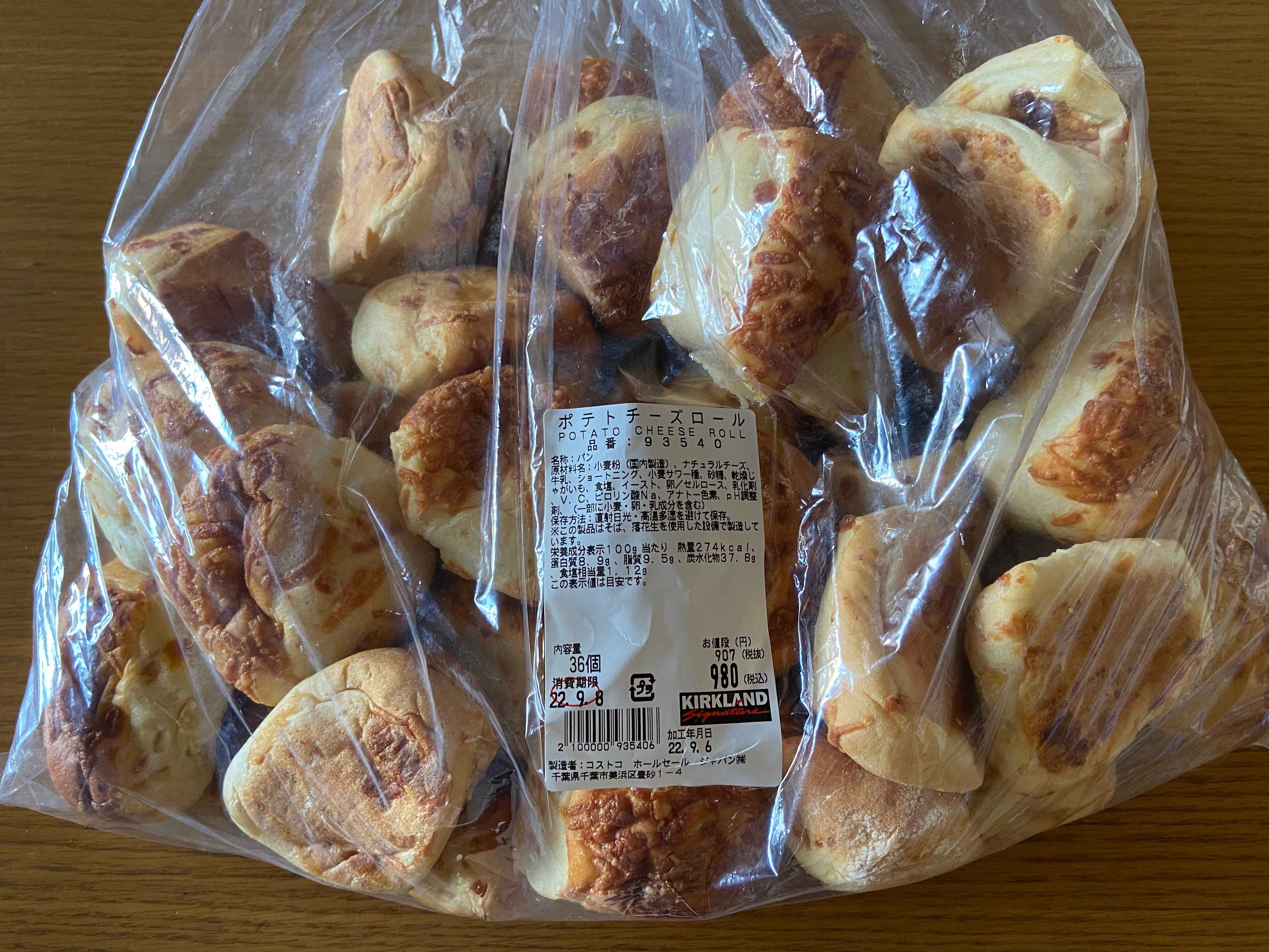 コストコで人気のディナーロールの進化形「ポテトチーズロール」(購入時:980円)。ディナーロールに比べればだいぶ高めの価格ですが、もっちりとした生地にチーズがたっぷりで香ばしく、おいしいパンでした。