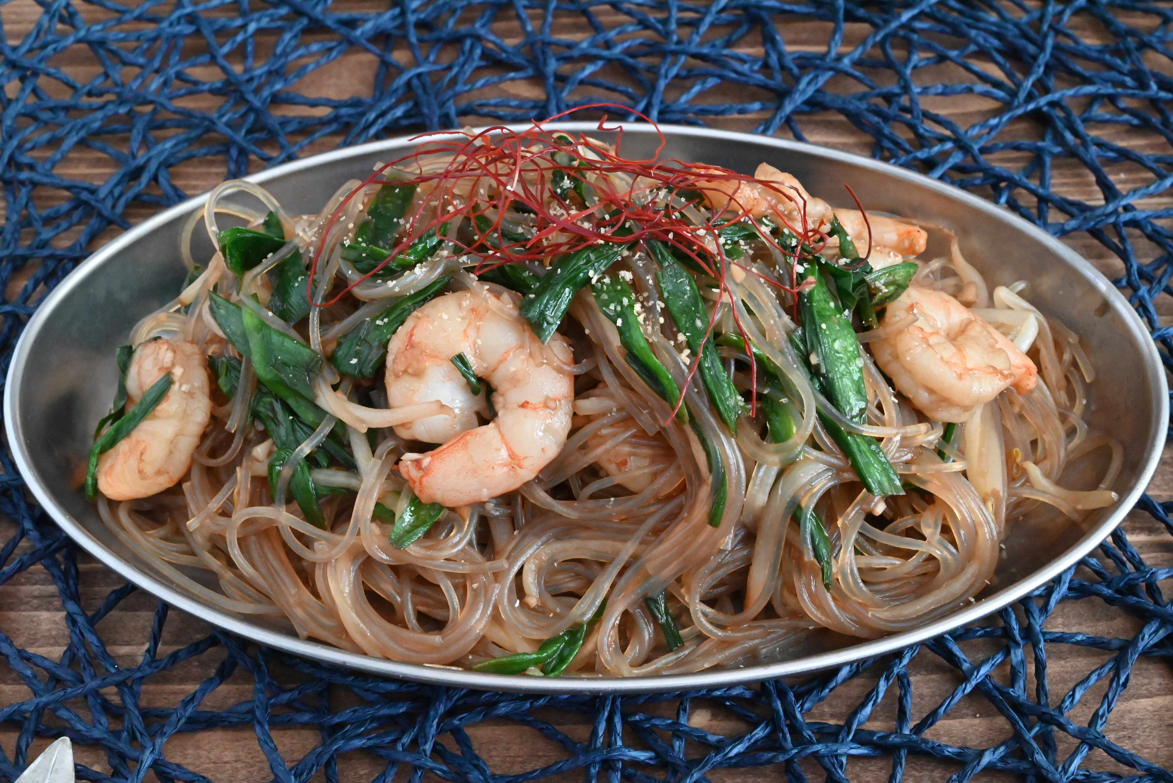 (5)海老に火が通ったら、にら、春雨、タマリンドペースト、鶏がらスープの素、めんつゆを加えて炒め合わせ、塩、粗びき黒こしょうで味を調えて完成。