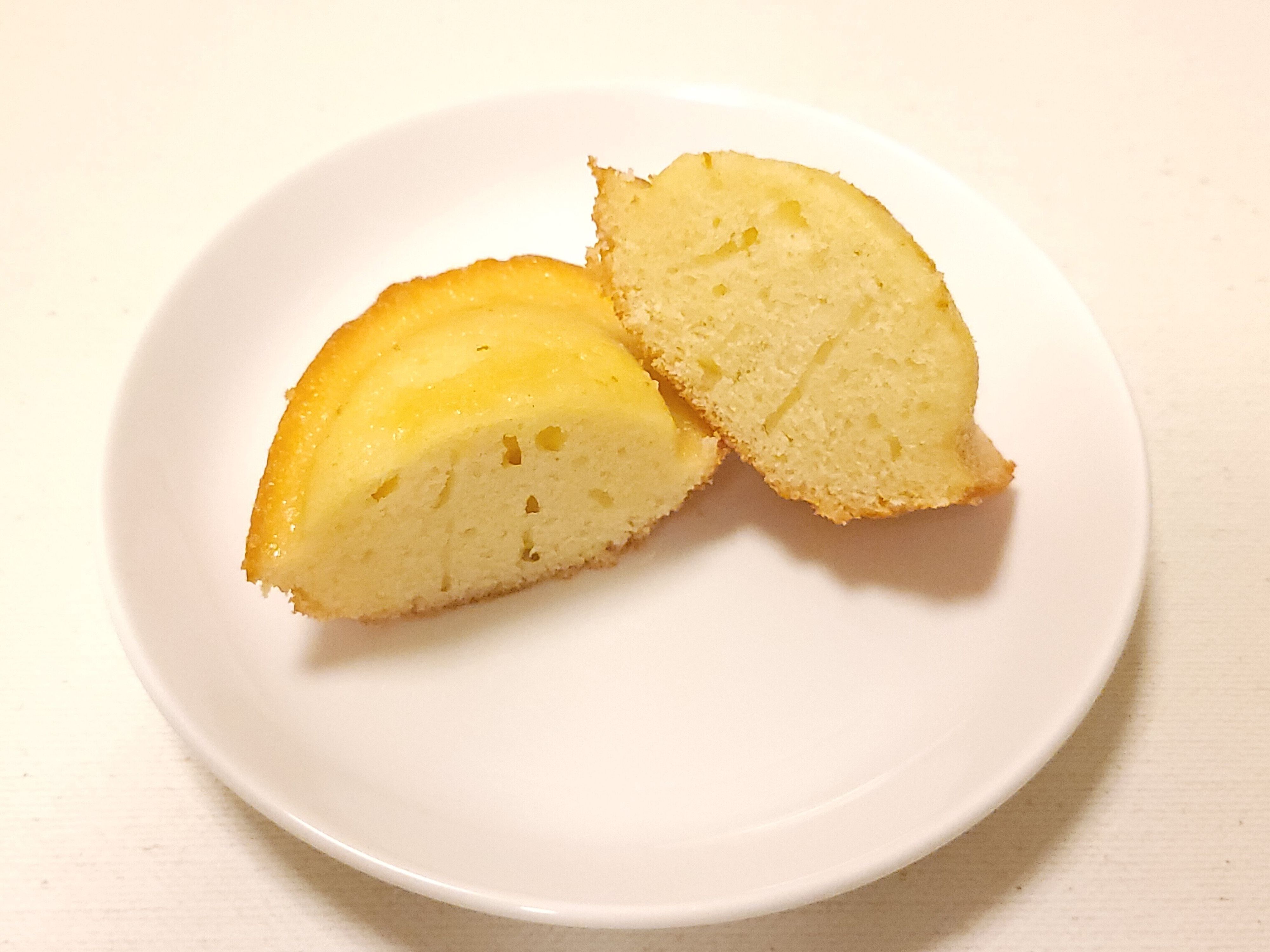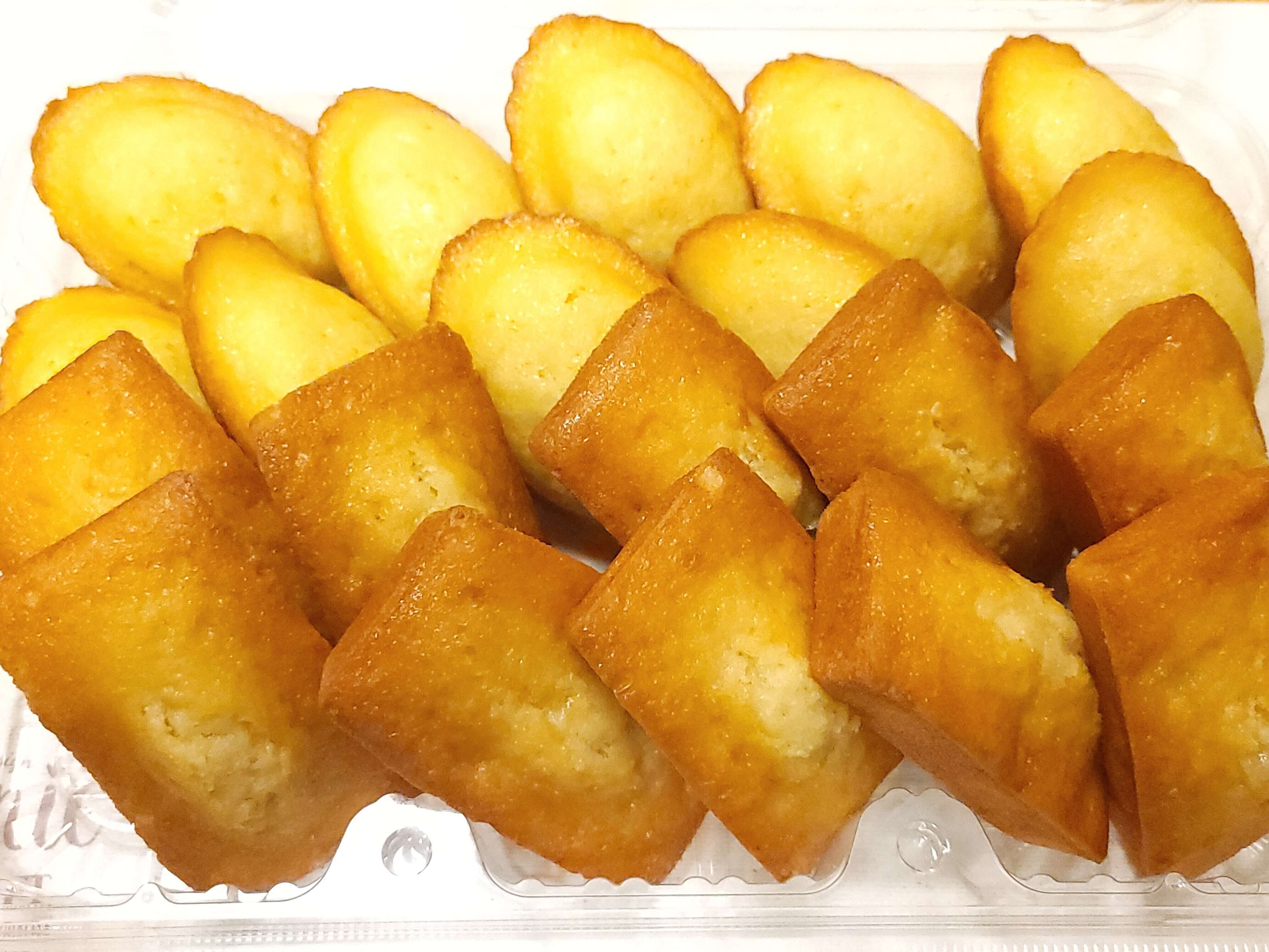 丸みをおびて貝の形をしているほうがマドレーヌです。重さを量ってみたところ1個44g前後で、1つで十分食べごたえのある大きさとなっています。しっとりとしてバターの風味もきちんとあり、甘さもちょうどよく仕上がっています。