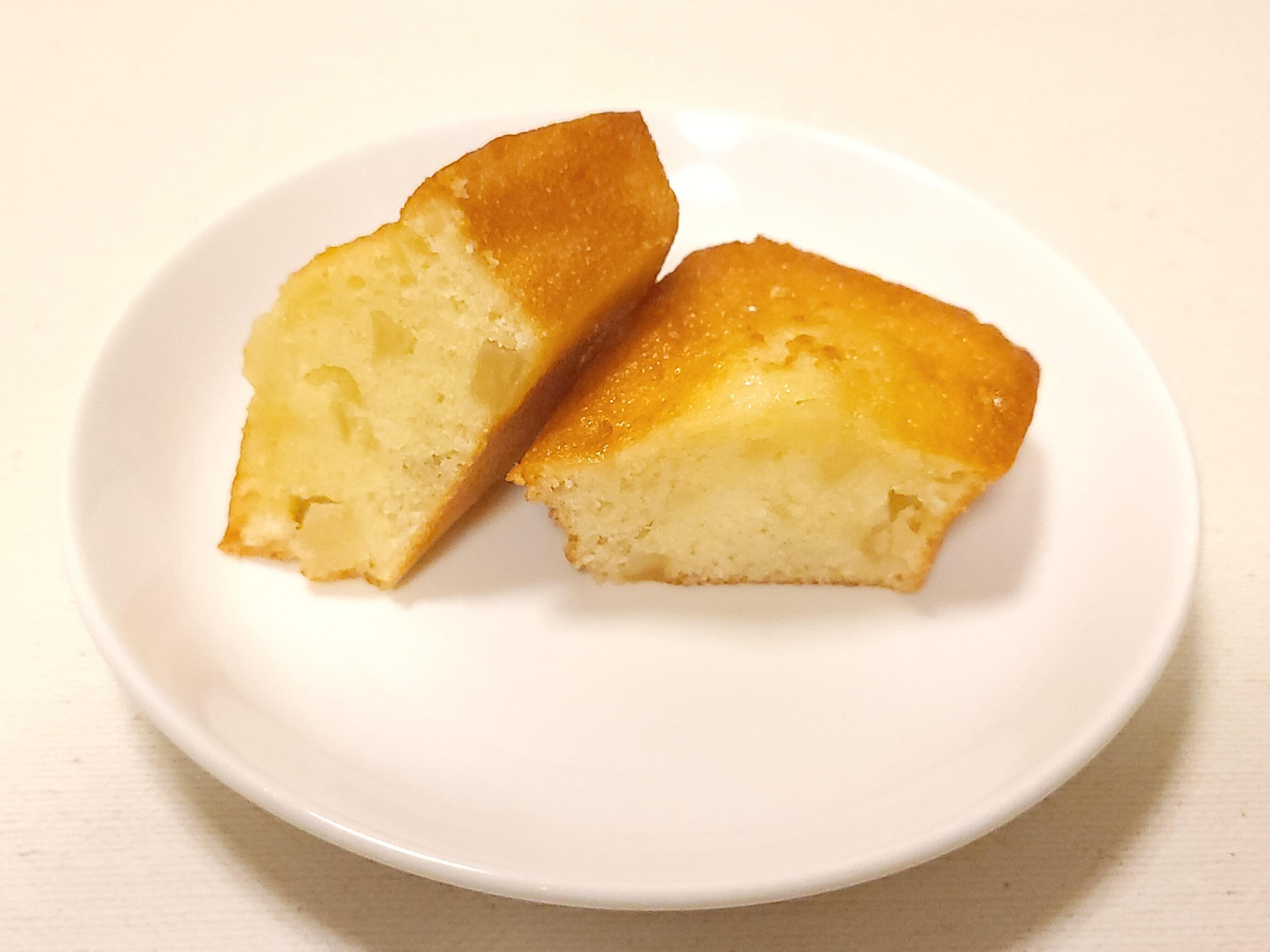 四角いフィナンシェのような形をしているほうがアップルケーキです。重さが1個58g前後あり、こちらも1つで十分の食べごたえです。マドレーヌよりさらにしっとり感があり、中に角切りリンゴが入っていて生地とこのリンゴの食感がベストマッチ。私の夫はアップルパイや焼きリンゴが苦手なのですが、こちらのアップルケーキはリンゴが細かく切ってあり、リンゴの食感も比較的シャキっとしているからか「おいしい!」と言って満足していました。