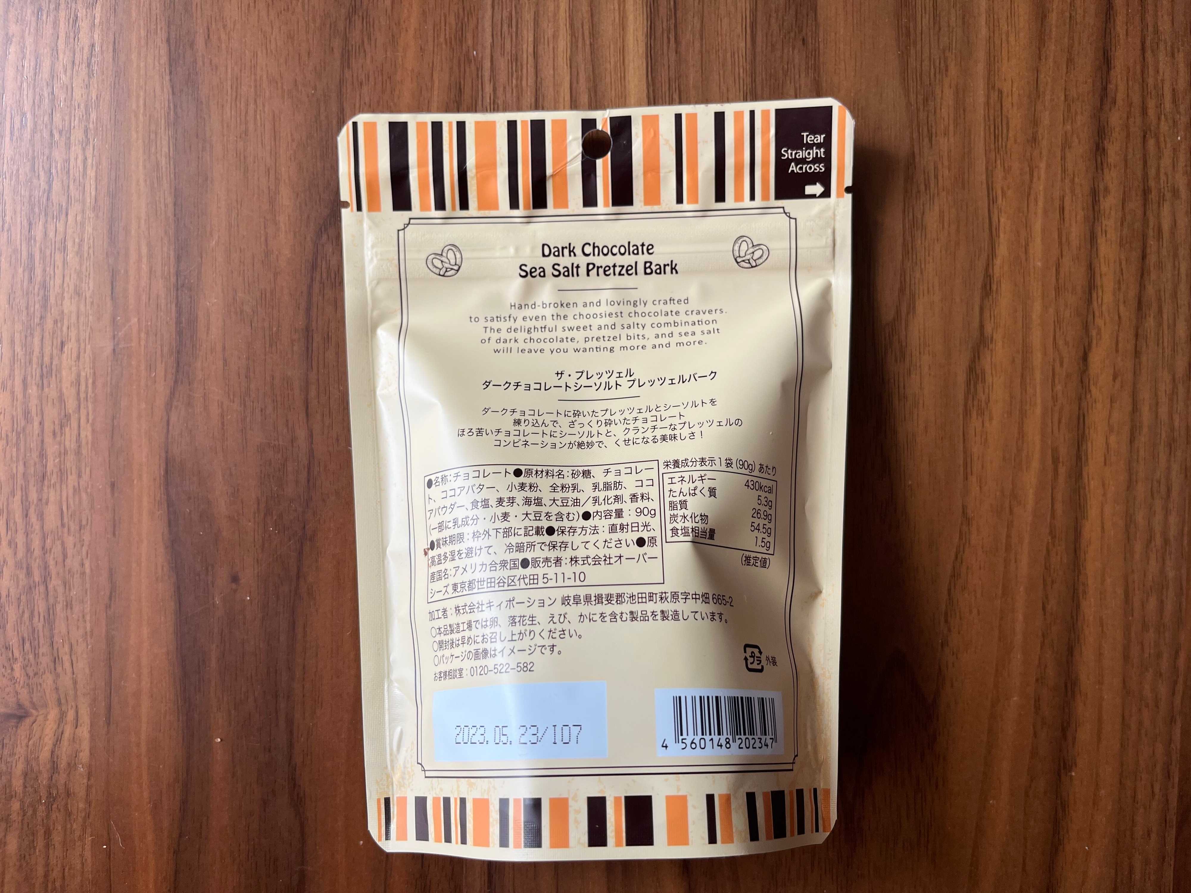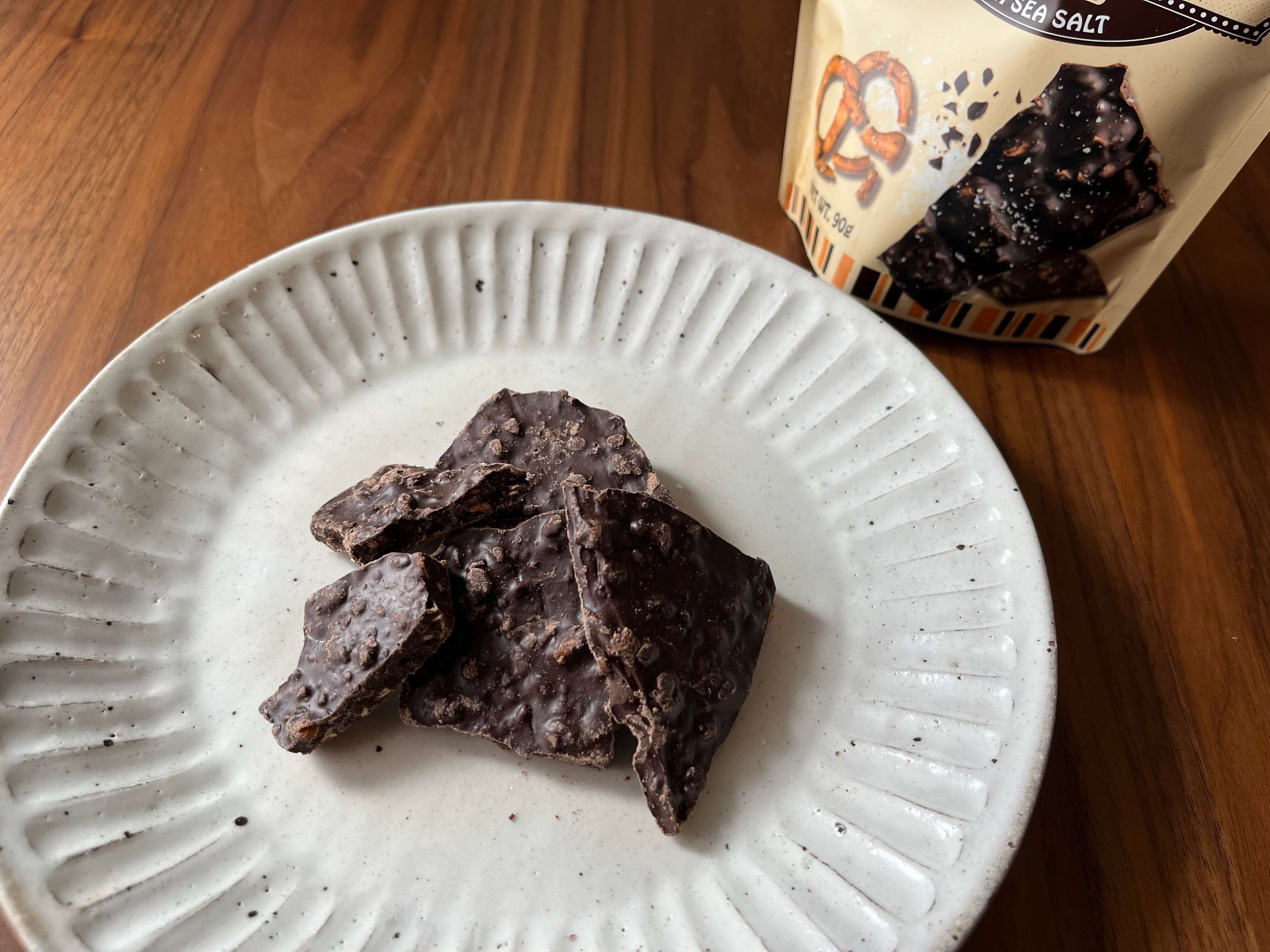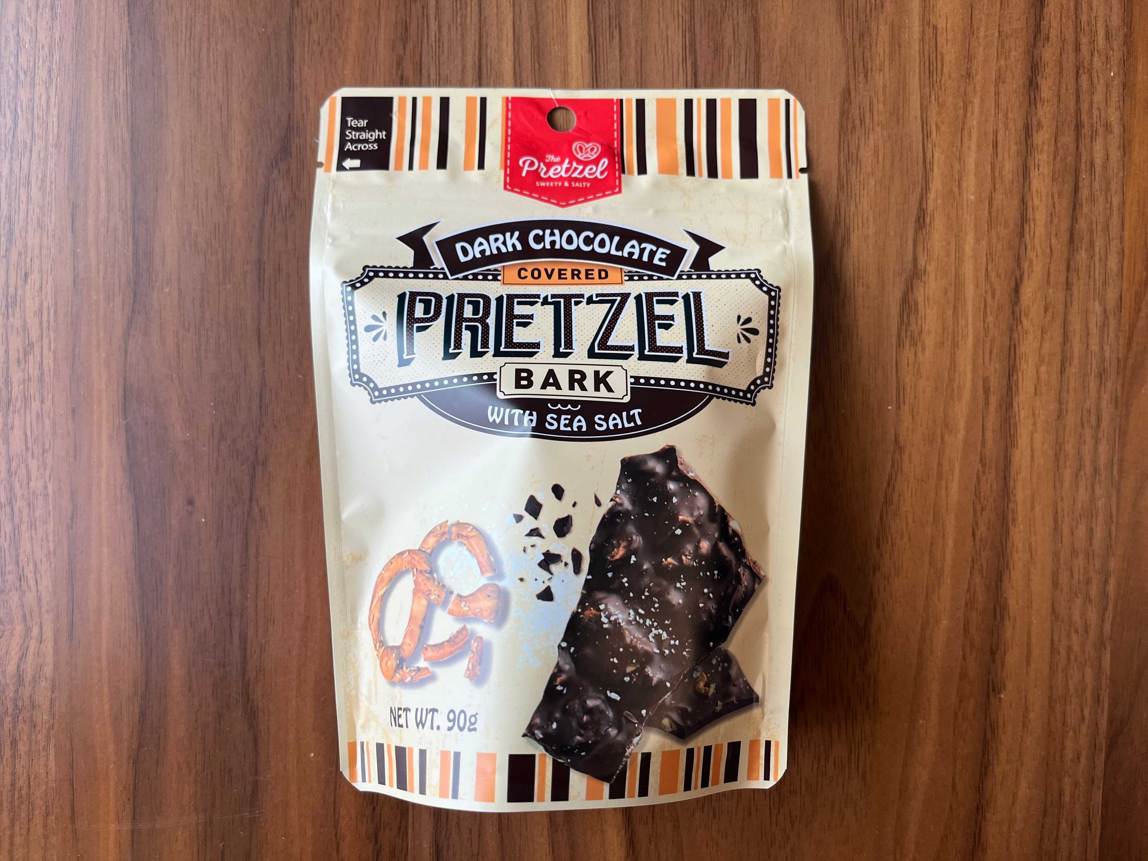 1品目は、「ザ・プレッツェル ダークチョコレートシーソルトプレッツェルバーク 90g」。砕いたプレッツェルとシーソルトが練り込まれたダークチョコレートです。
