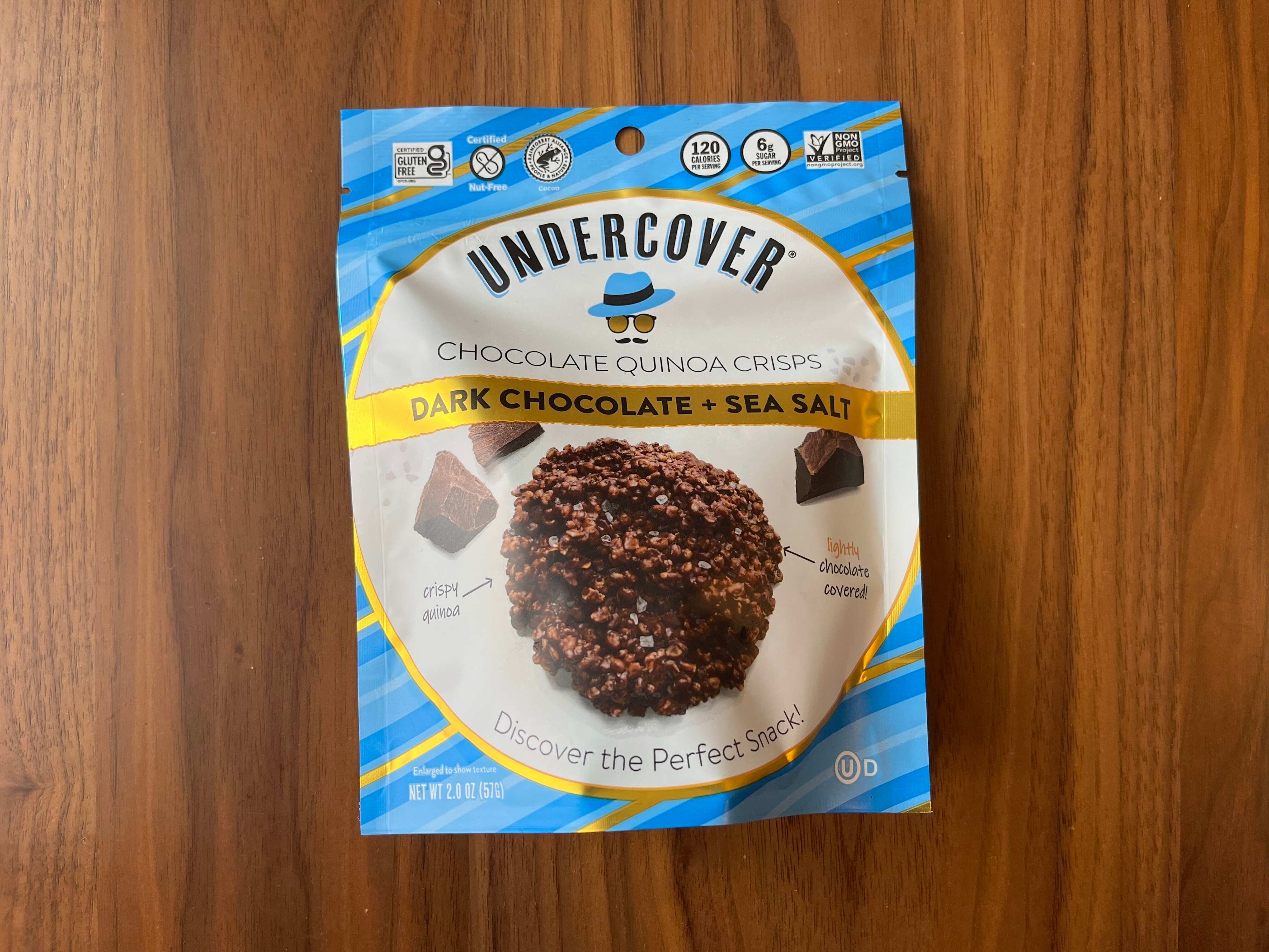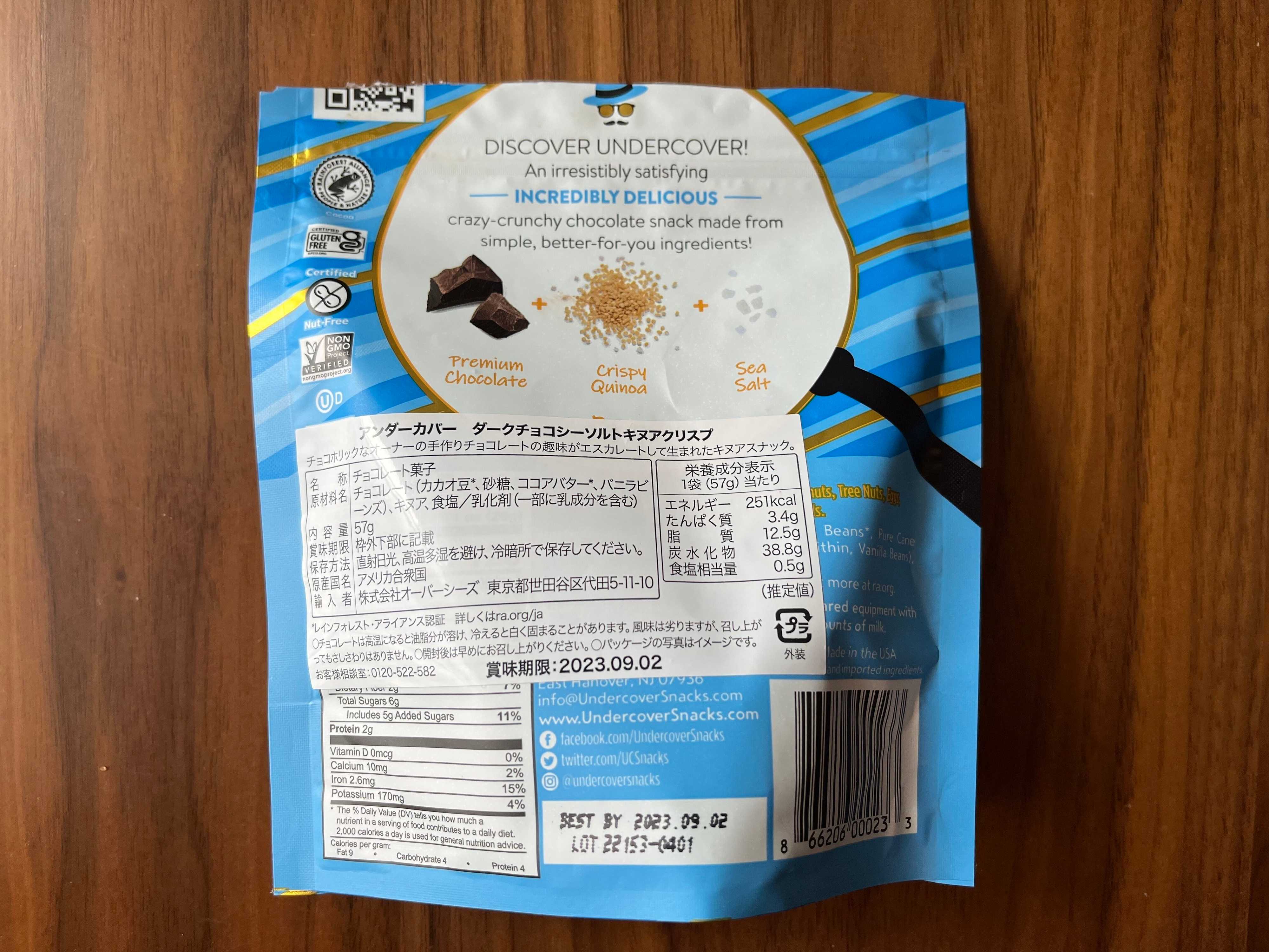 2品目は「アンダーカバー ダークチョコレートシーソルトキヌアクリスプ 57g」。キヌアパフとシーソルトが、ダークチョコレートに練り込まれています。