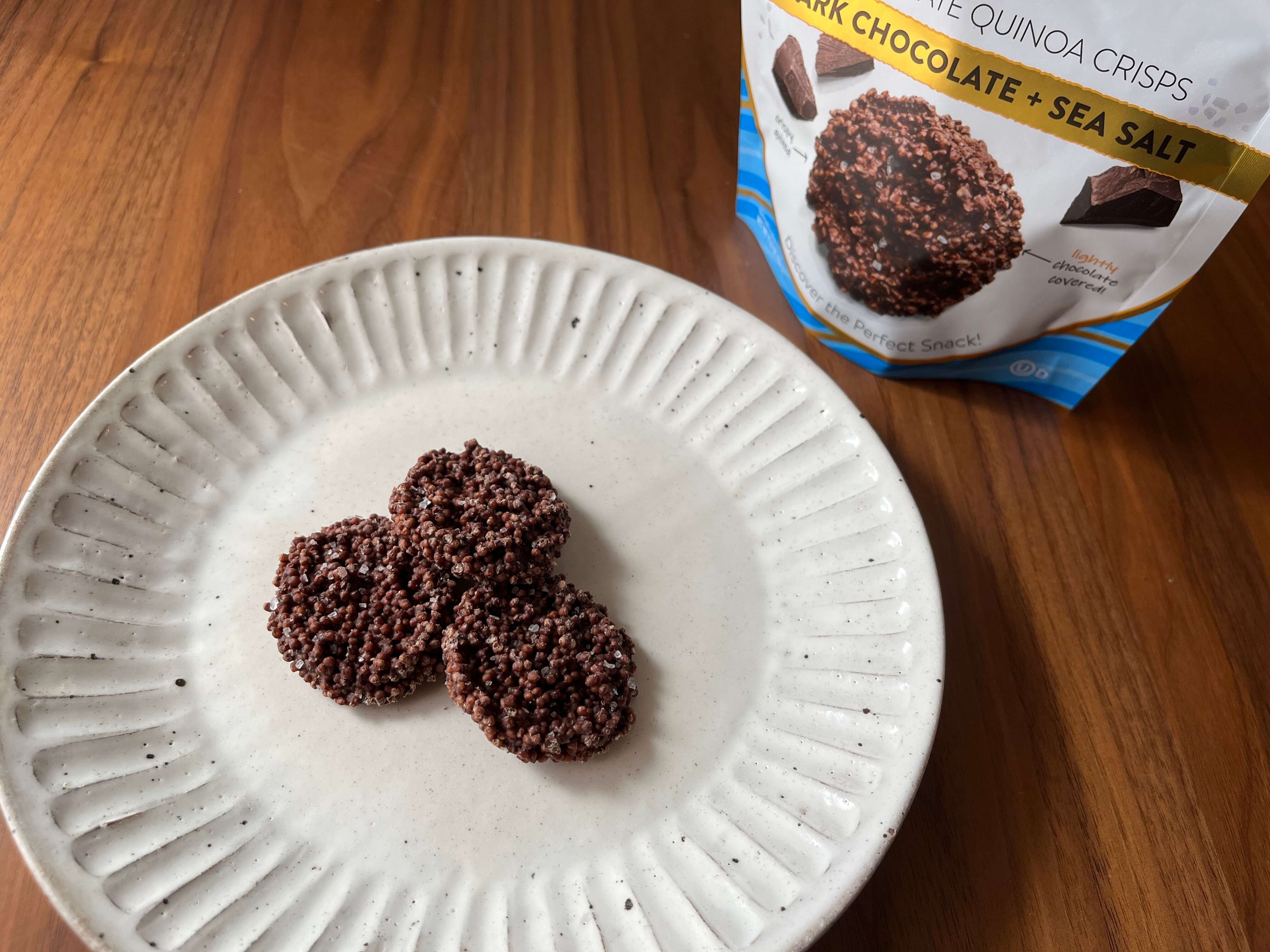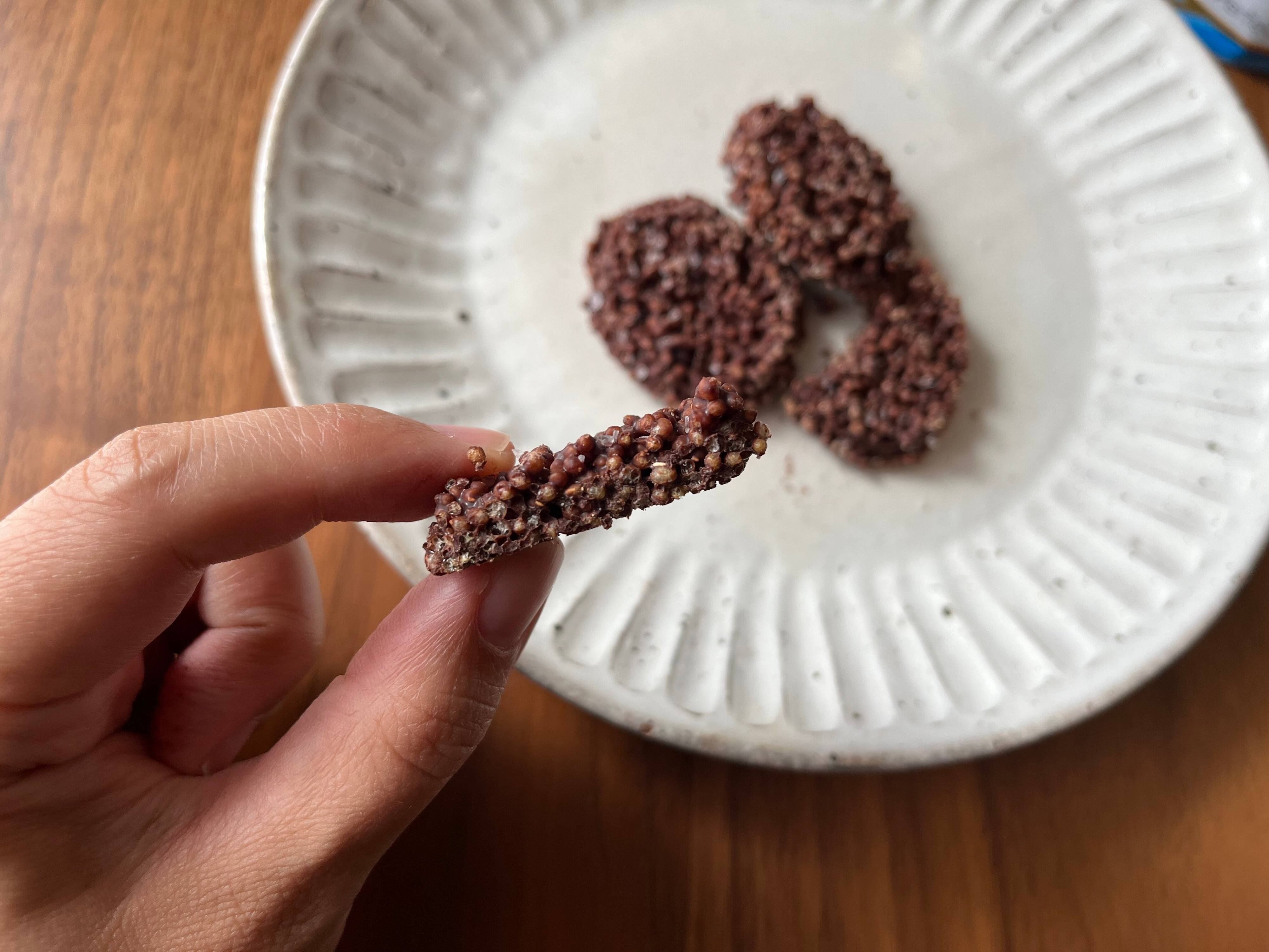 味わいは……、まず塩っ気がガツンときます。個人的には、塩っ気がちょっと強すぎると感じるくらいのパンチ。その後にチョコレートの甘さとキヌアパフの香ばしさ。味わいも軽やかなので、チップス感覚でポイポイ食べられてしまいます。