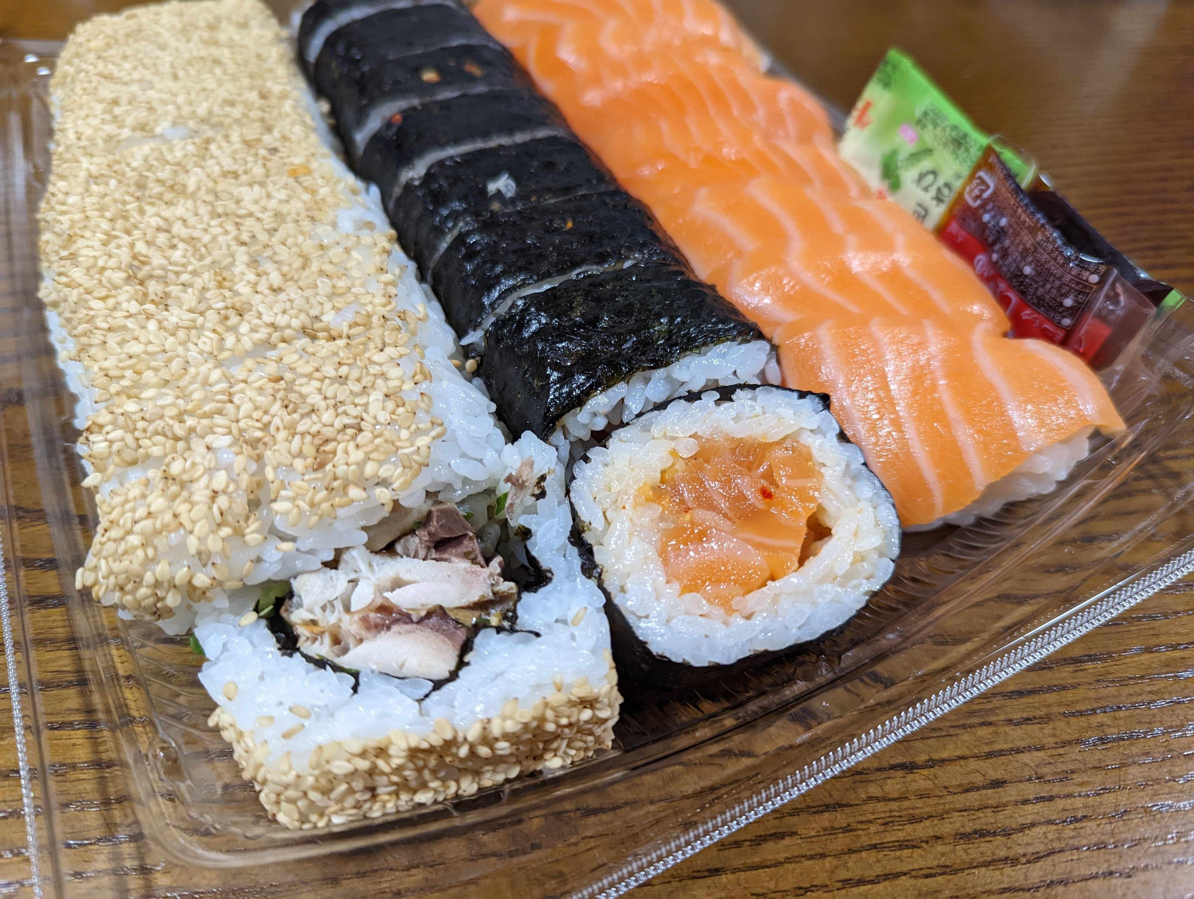 こちらはごま油の風味が効いているサーモンポキが巻かれています。ご飯と海苔とのバランスが最高! 大きいですが一口でパクっといけば幸せ間違いなしです。