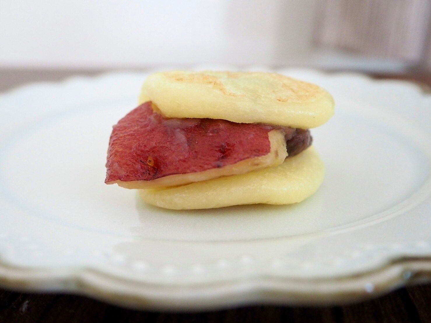 お餅からはみ出すほどごろっと大きいお芋は甘露煮で、ひとくち食べるとお芋の自然な甘みがくちいっぱいに広がります。