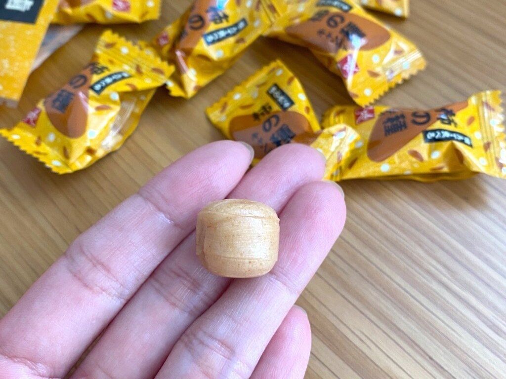 外側は薄皮のきなこキャンディ、中心部には柿の種の味を再現したソフトキャンディとクラッシュした柿の種が入っています。