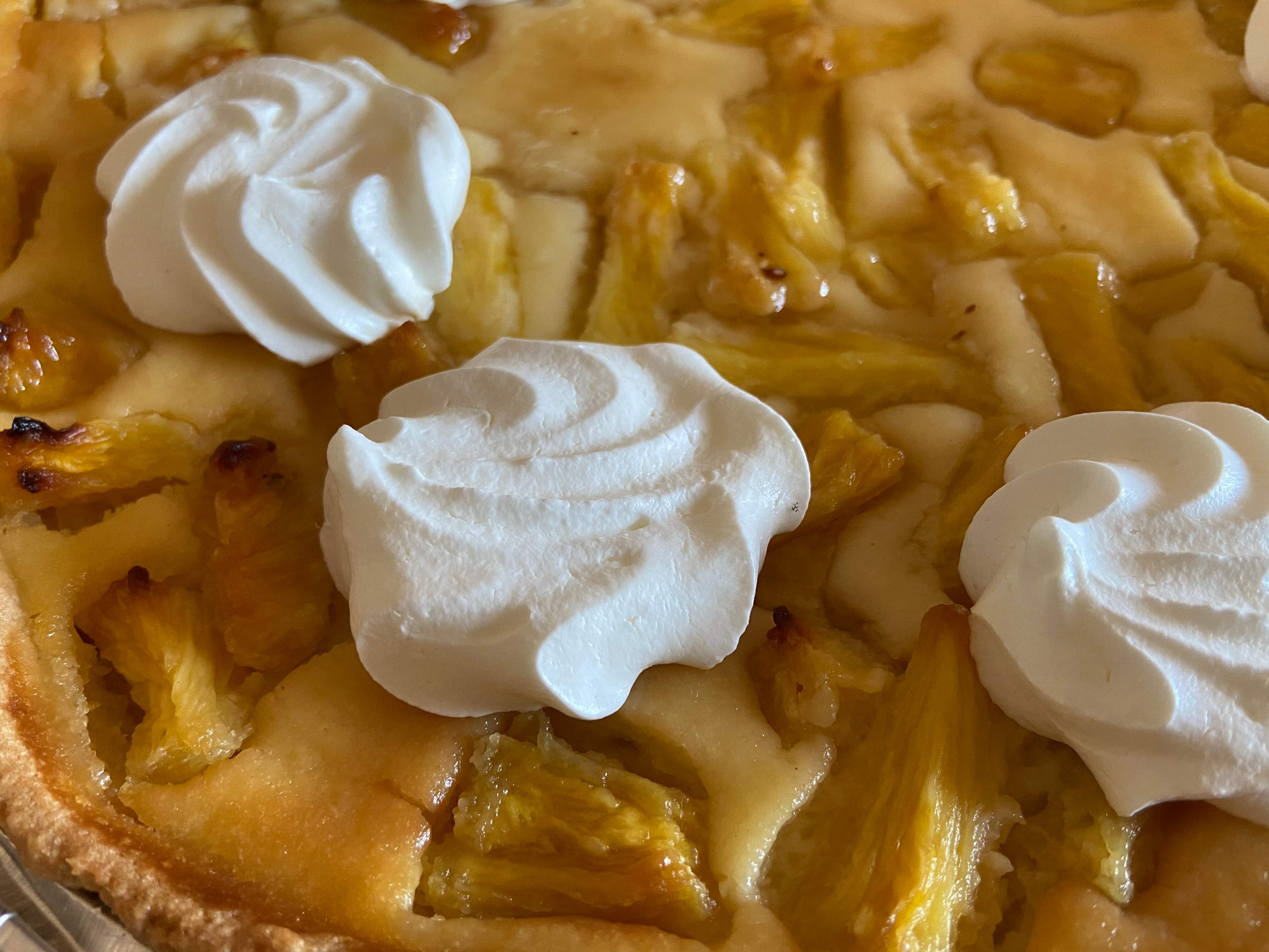 サクサクのタルト台にたっぷりのカスタードフィリング、カットされたパイナップルがたっぷりのって、仕上げにホイップクリームが8カ所にトッピングされています。