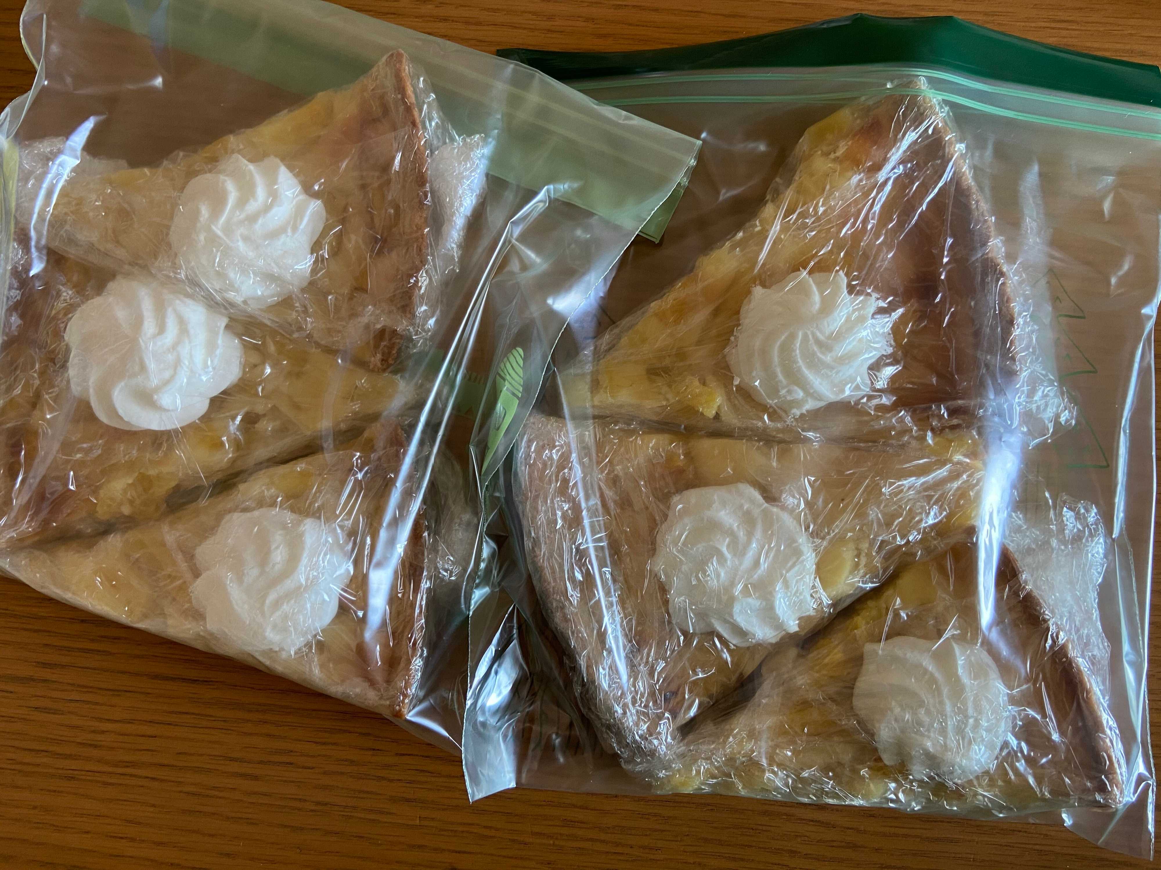 大きなタルトなので、すぐに食べないぶんはラップして保存袋に入れて冷凍保存。食べる時は、冷蔵庫でゆっくり解凍すればおいしく食べることができますよ。