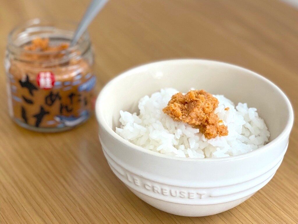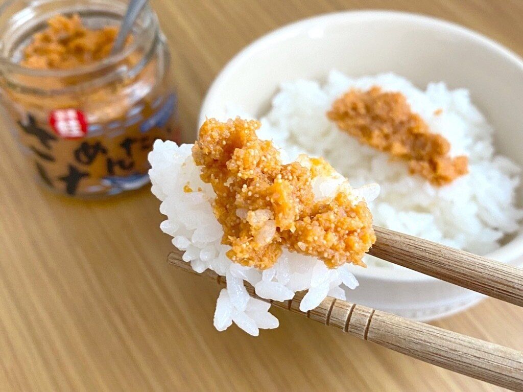 白いご飯の上にのせてみると、しっとりしたさけのペーストにスケソウダラの卵がたっぷり混ぜ込まれているのがわかります。