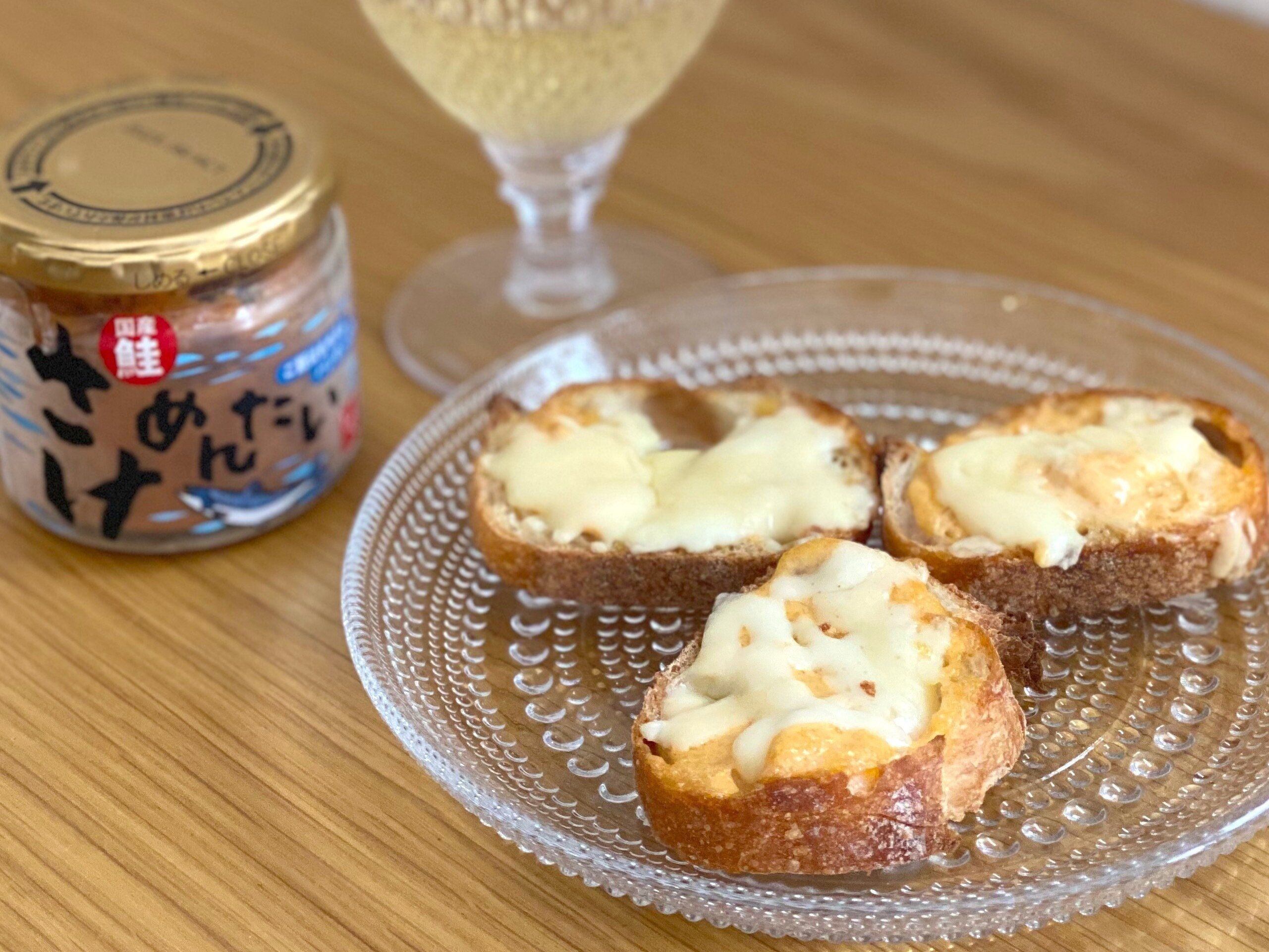 さけめんたいとマヨネーズを合わせてバケットにぬり、チーズをのせて焼くと、ワインにピッタリのおつまみになりますよ。