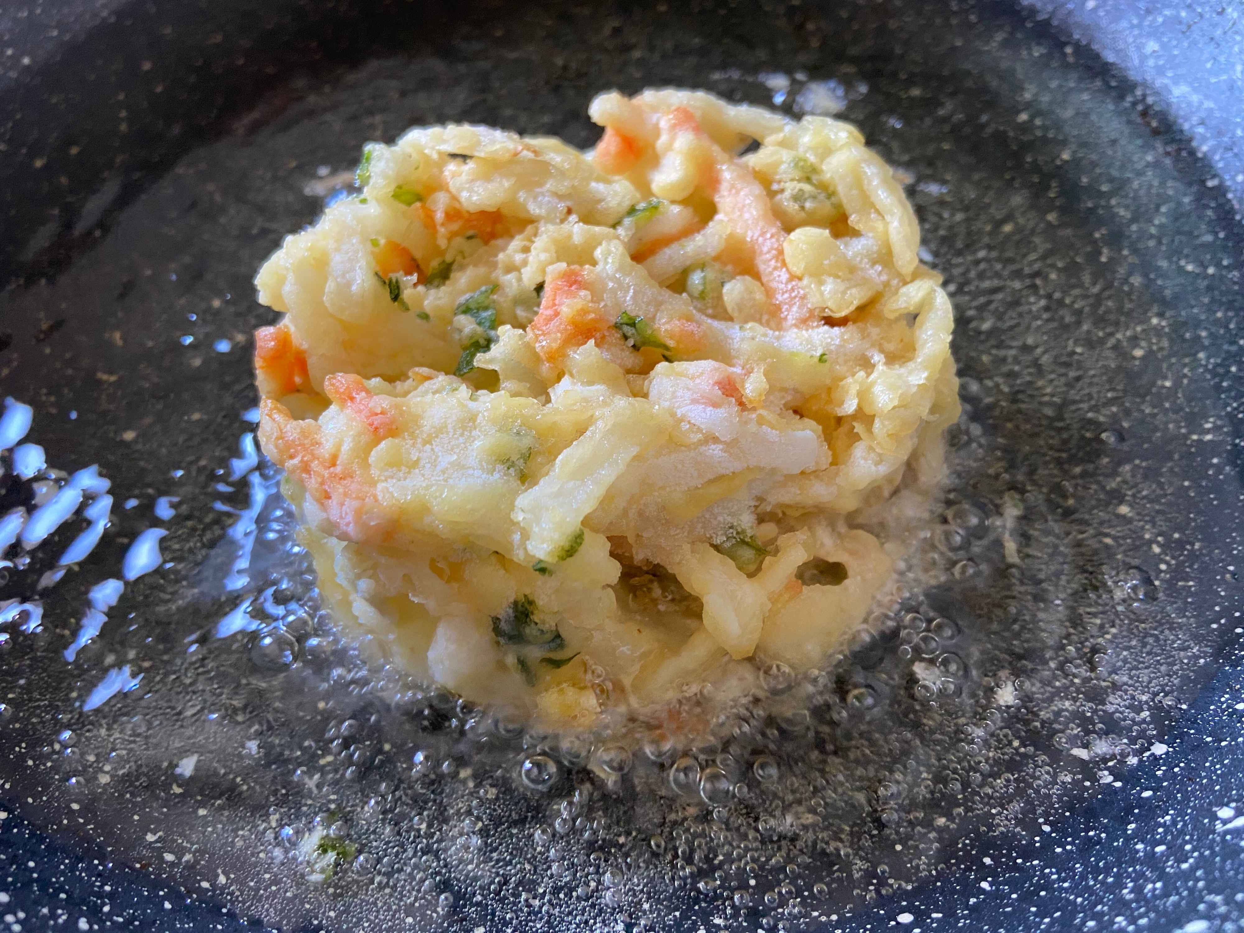 いつもフライパンで少な目の油で揚げ物をしている我が家。かき揚げは高さがあってボリューム満点なので、できればたっぷりの油で揚げたほうがよさそうです。筆者は数回ひっくり返しながら、揚げました。