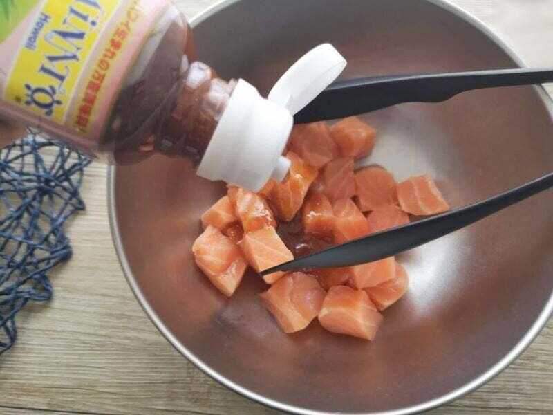 カットしたサーモンをボウルに入れたら…