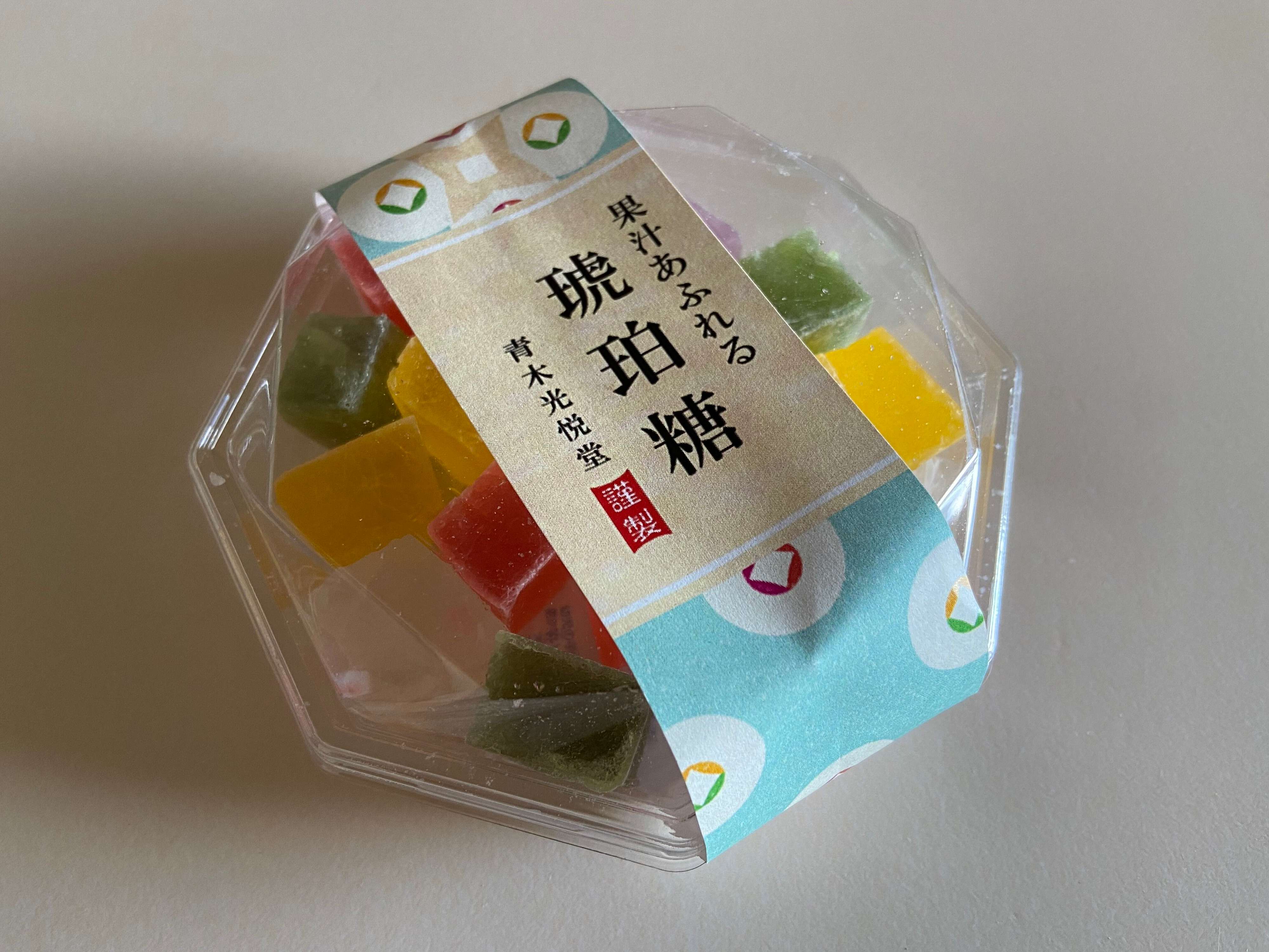 成城石井のお菓子コーナーに並んでいた「琥珀糖」(購入時:454円)。京都の青木光悦堂という老舗が作る琥珀糖です。