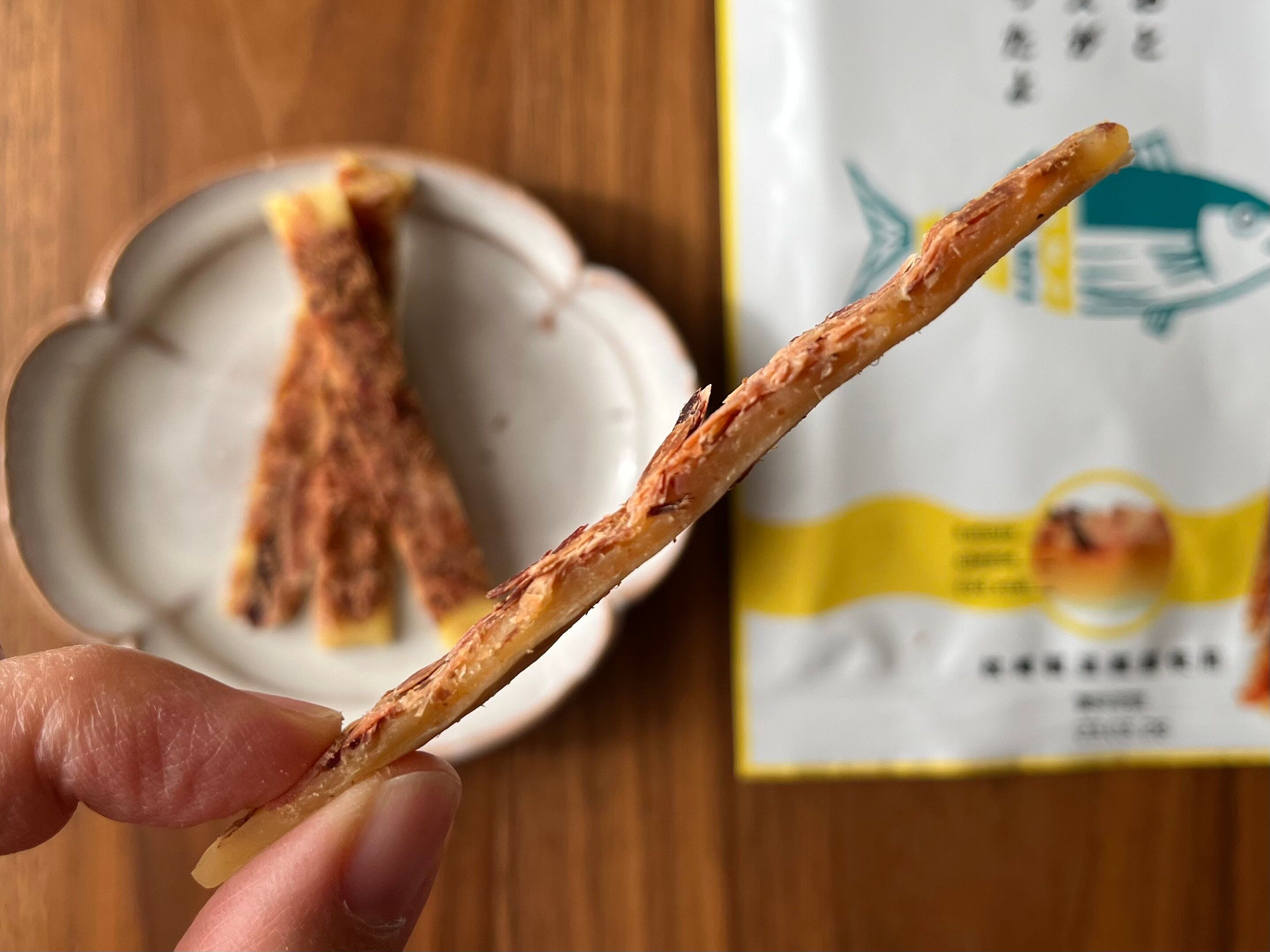 そして食べてみると、押し寄せてくる旨味がすごい!チーズのグルタミン酸に、かつお節のイノシン酸のダブルパンチ。チーズとかつおだけだと、ほろほろとほぐれて味わいも分散してしまいそうですが、ここで活躍するのがタラのシート。このおかげで全体がひとまとまりになるので、もぐもぐと噛むほどにかつお節の旨味が染み出し、チーズのコクも重なっていきます。