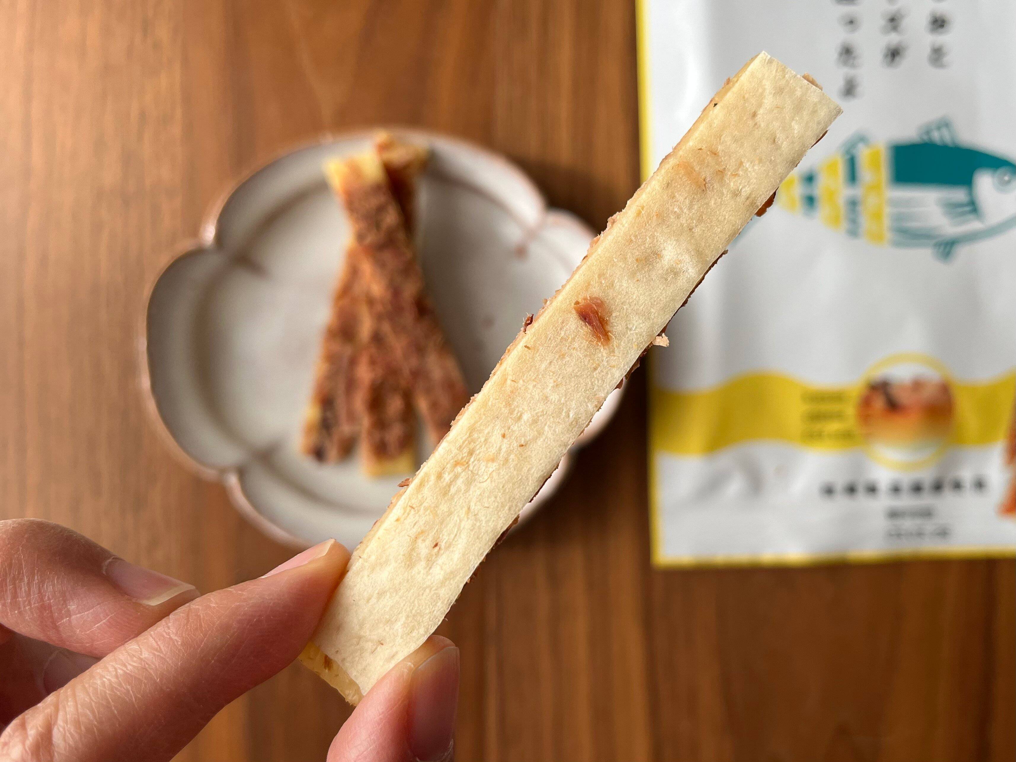 袋を開けると、チーズスティックが8本。幅1cmほどと太く、これでもか!という量の鰹節が貼りついています。