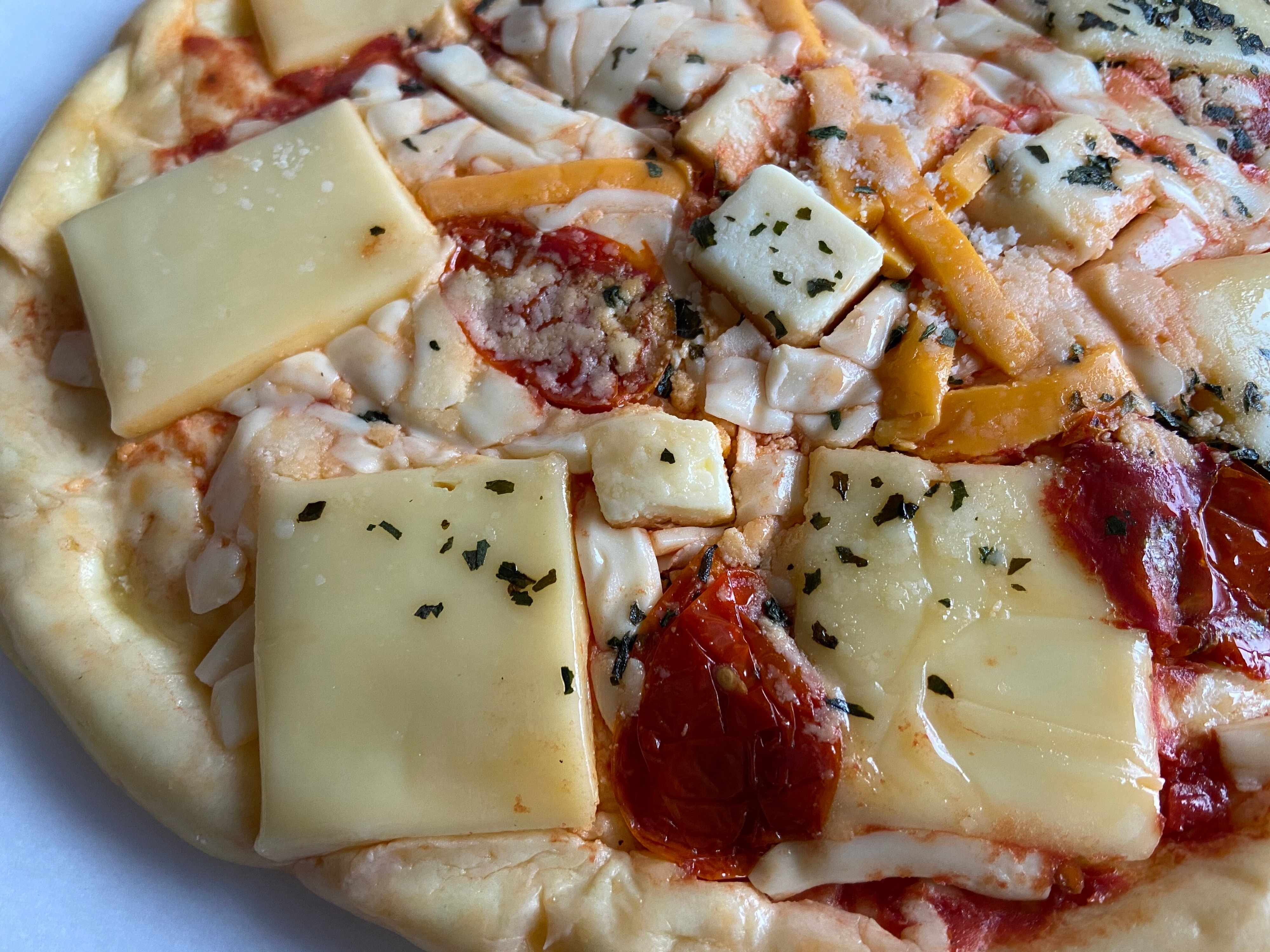 成城石井のセントラルキッチンで製造された自家製のピザで、イギリス産のホワイトチェダー、フランス産ミモレット、モッツァレラ、イタリア産パルミジャーノ・レジャーノ、ステッペンの5種のチーズが使用されています。