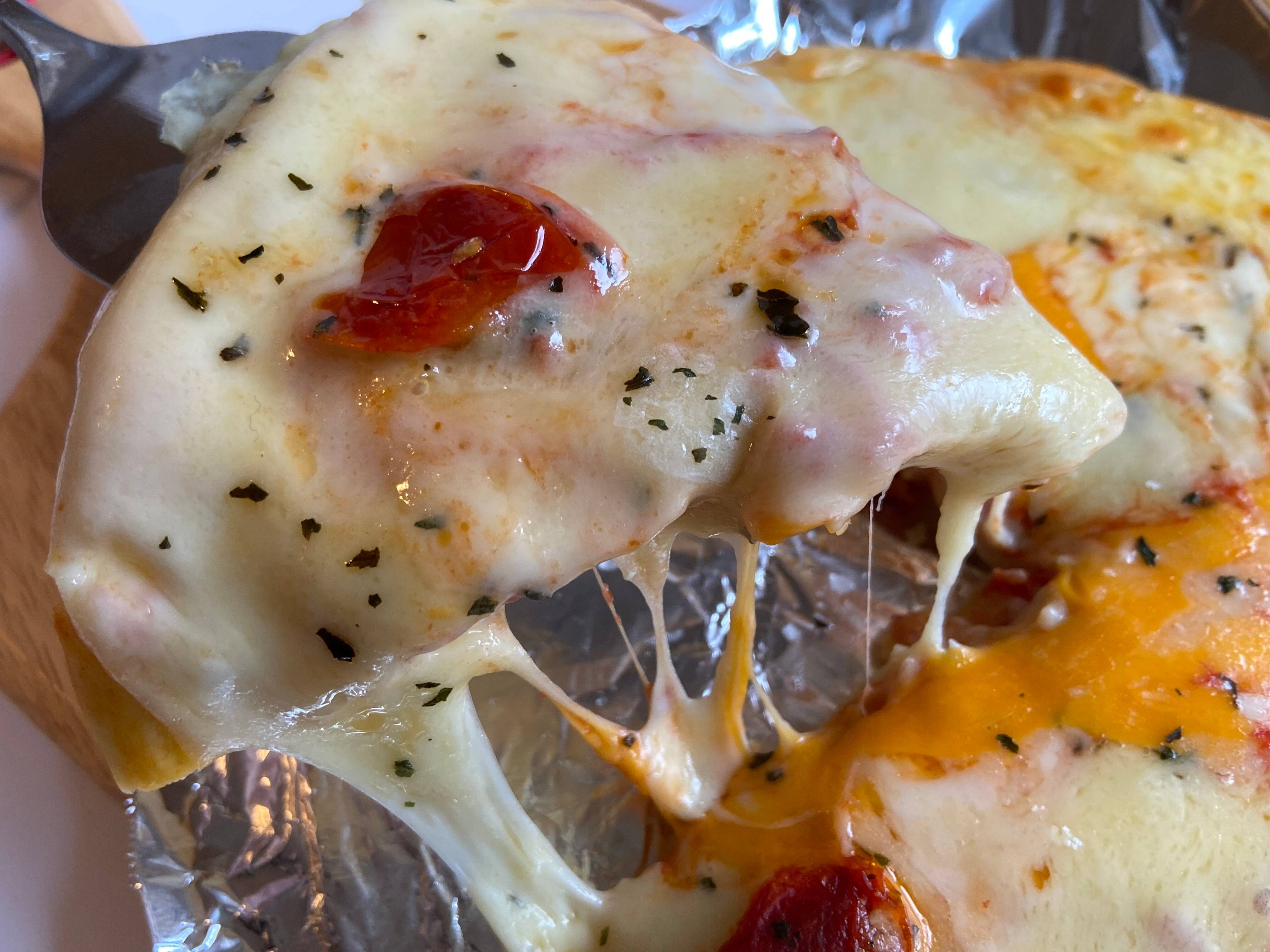 成城石井で販売されている人気の「ピッツァマルゲリータ」の1.7倍のチーズを使用しているそうで、とにかくチーズの量がすごいんです。カットするとびよーんととろけて、とっても伸びのいいチーズ!
