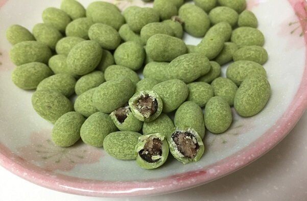 北海道産十勝あずきの甘納豆にホワイトチョコをコーティングし、宇治抹茶のパウダーがまぶされていて香りもとってもいいんです。