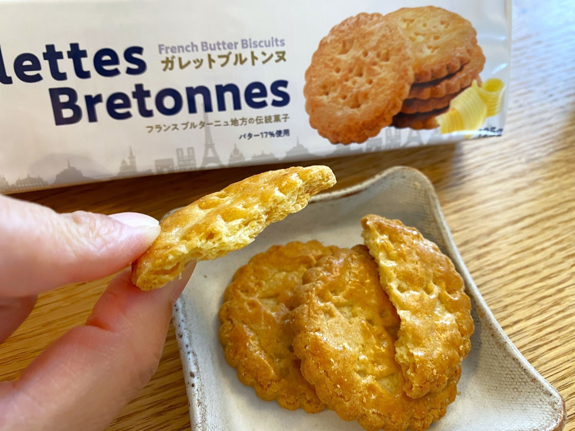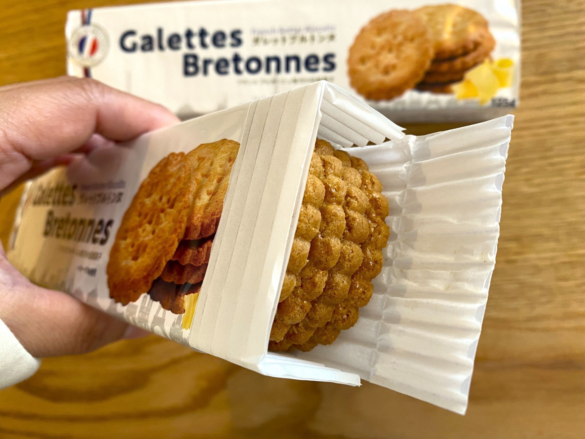 横から見ると6mmぐらいでしょうか。ケーキ屋さんに売っているガレットブルトンヌはもっと厚みがあるものが多いですが、こちらは見た感じはふつうのクッキーです。