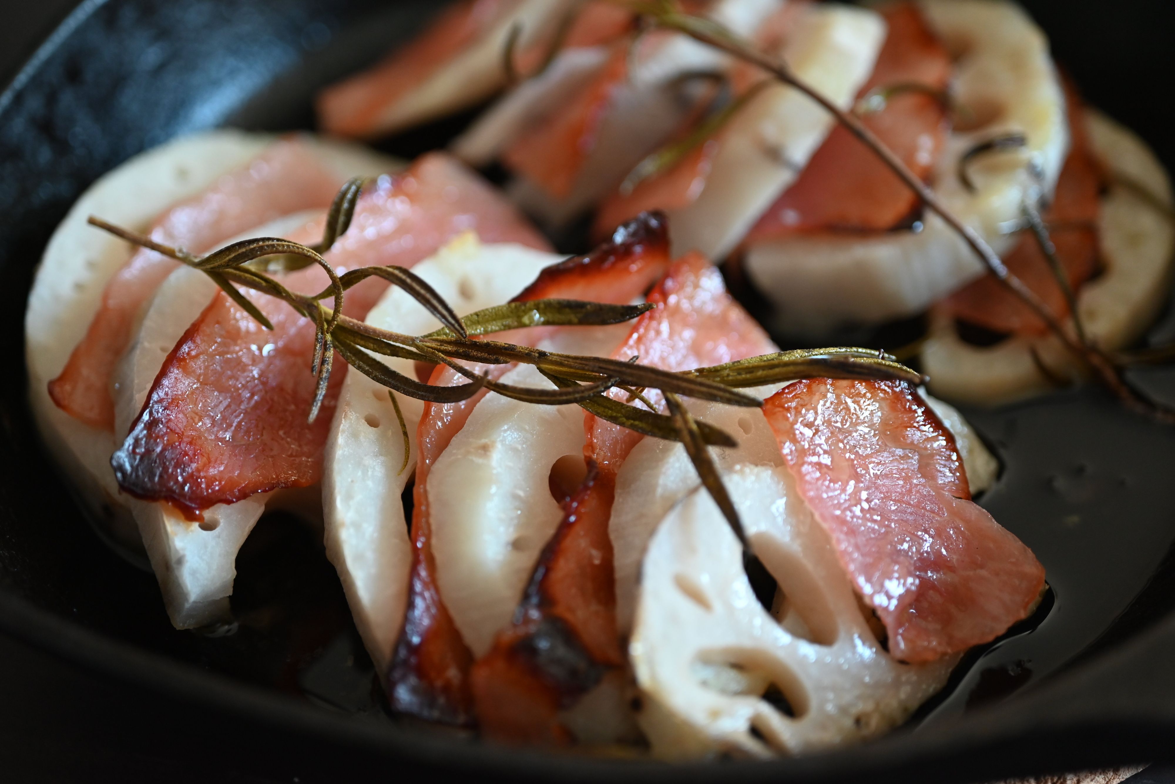 (2)スキレットにれんこんと生ハムを交互に並べいれていく。