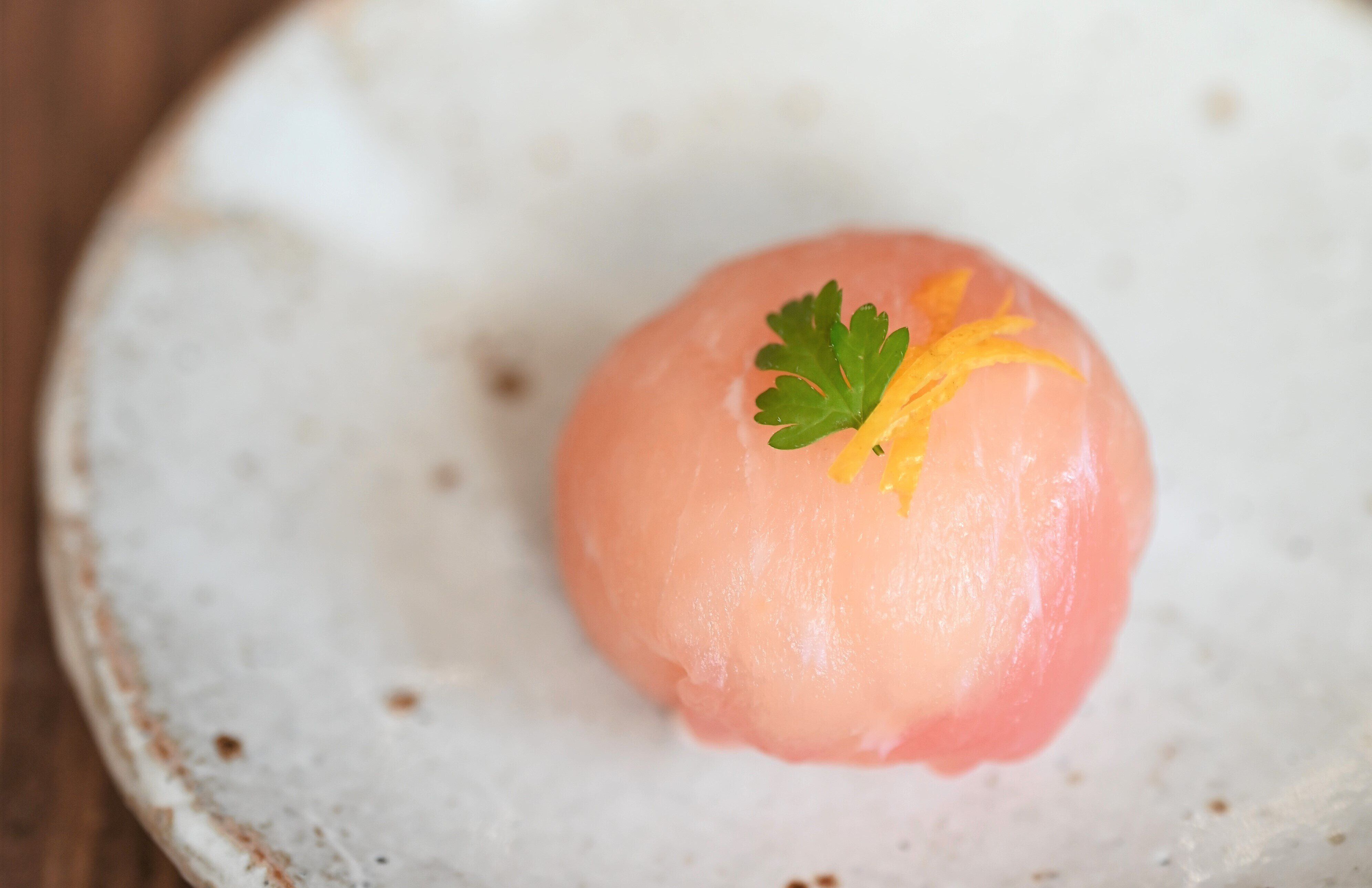 (2)ラップに生ハムをのせ、(1)をのせて丸く包む。