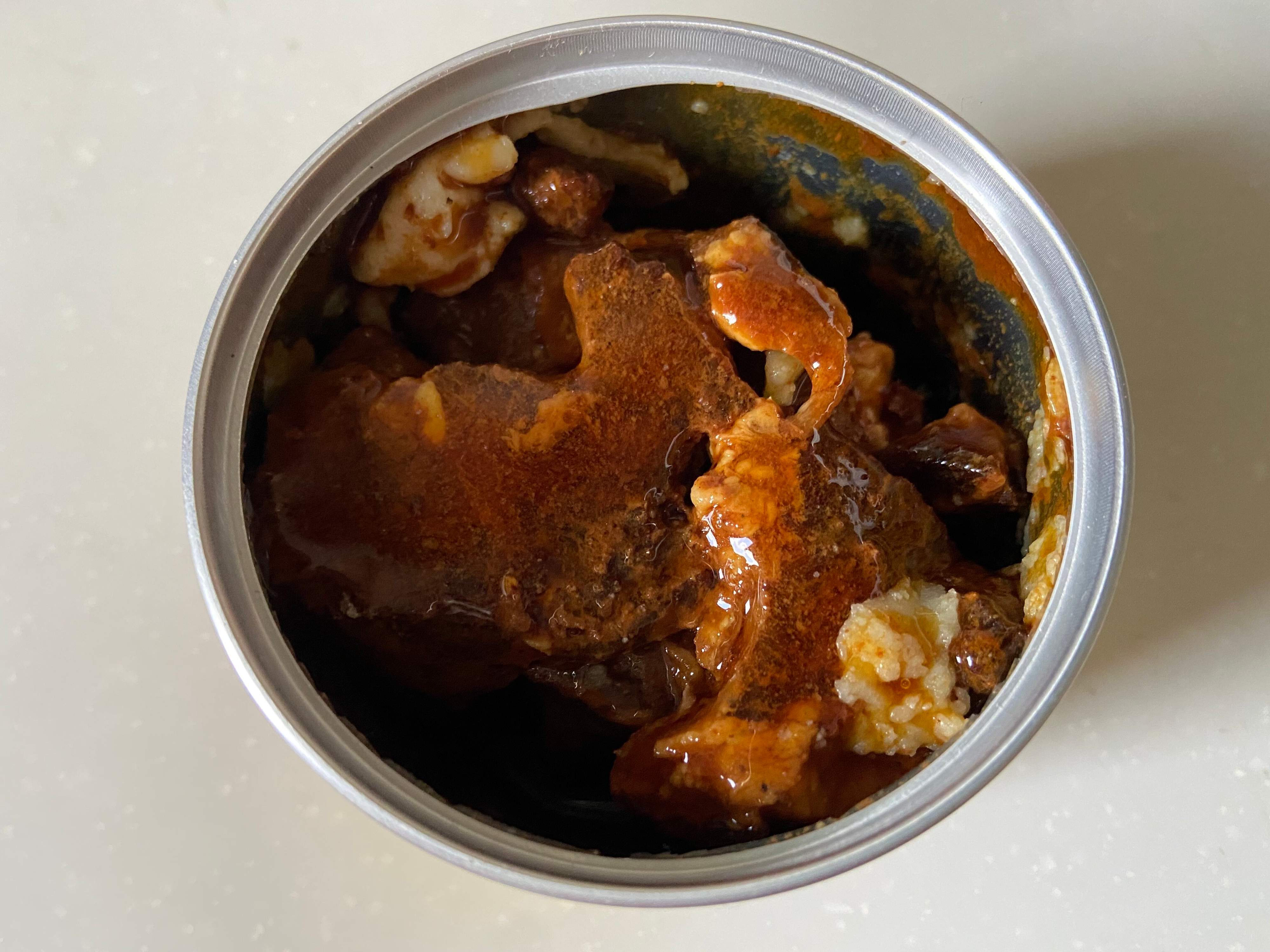 缶を開けてみると、ごろっと大きなお肉とタレがたっぷり。