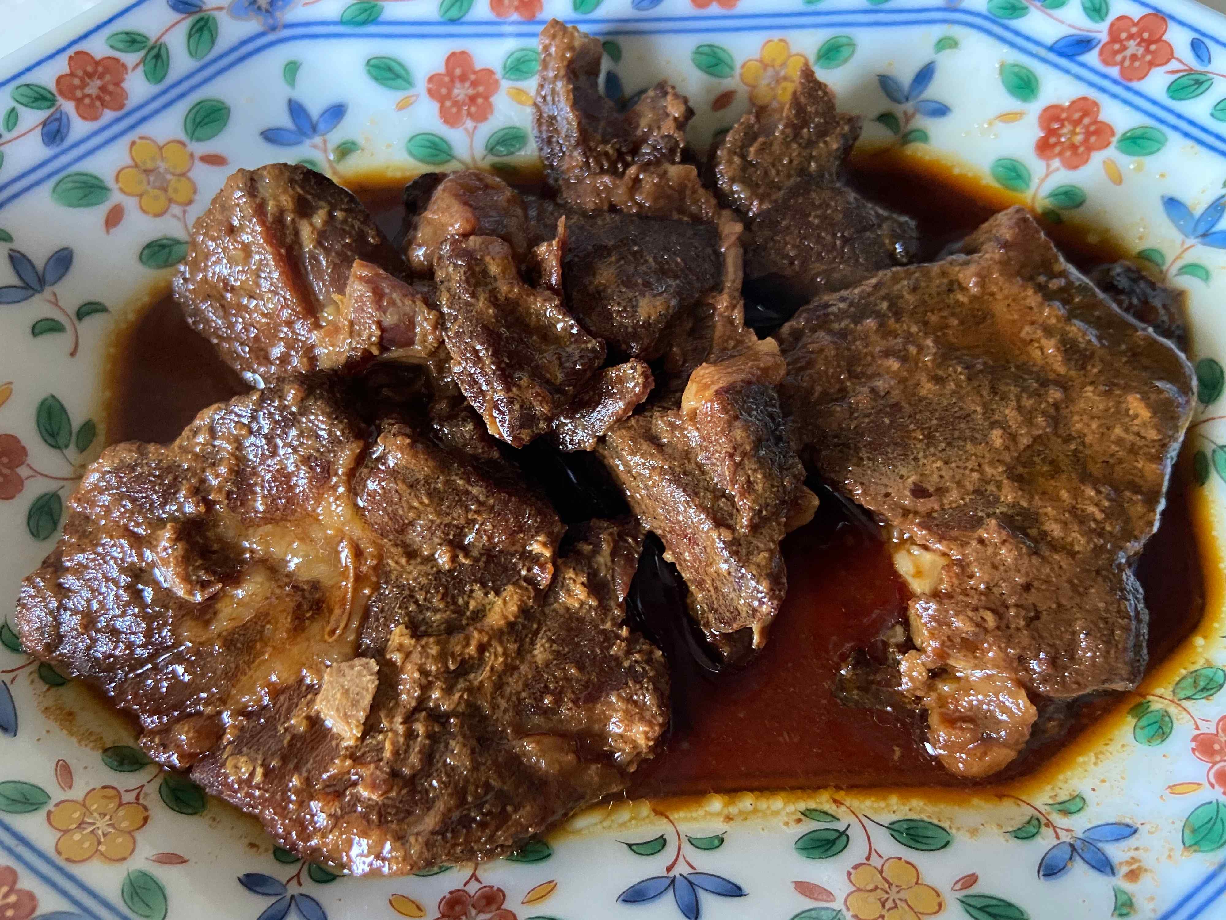 食べてみると、しっかり濃い目の甘辛いタレが染み込んだお肉はほろほろと柔らかくとってもおいしいです。八角、シナモン、クローブ、花椒が香る五香粉入りとのことで、スパイス感もたっぷり。大人向けの味わいです!
