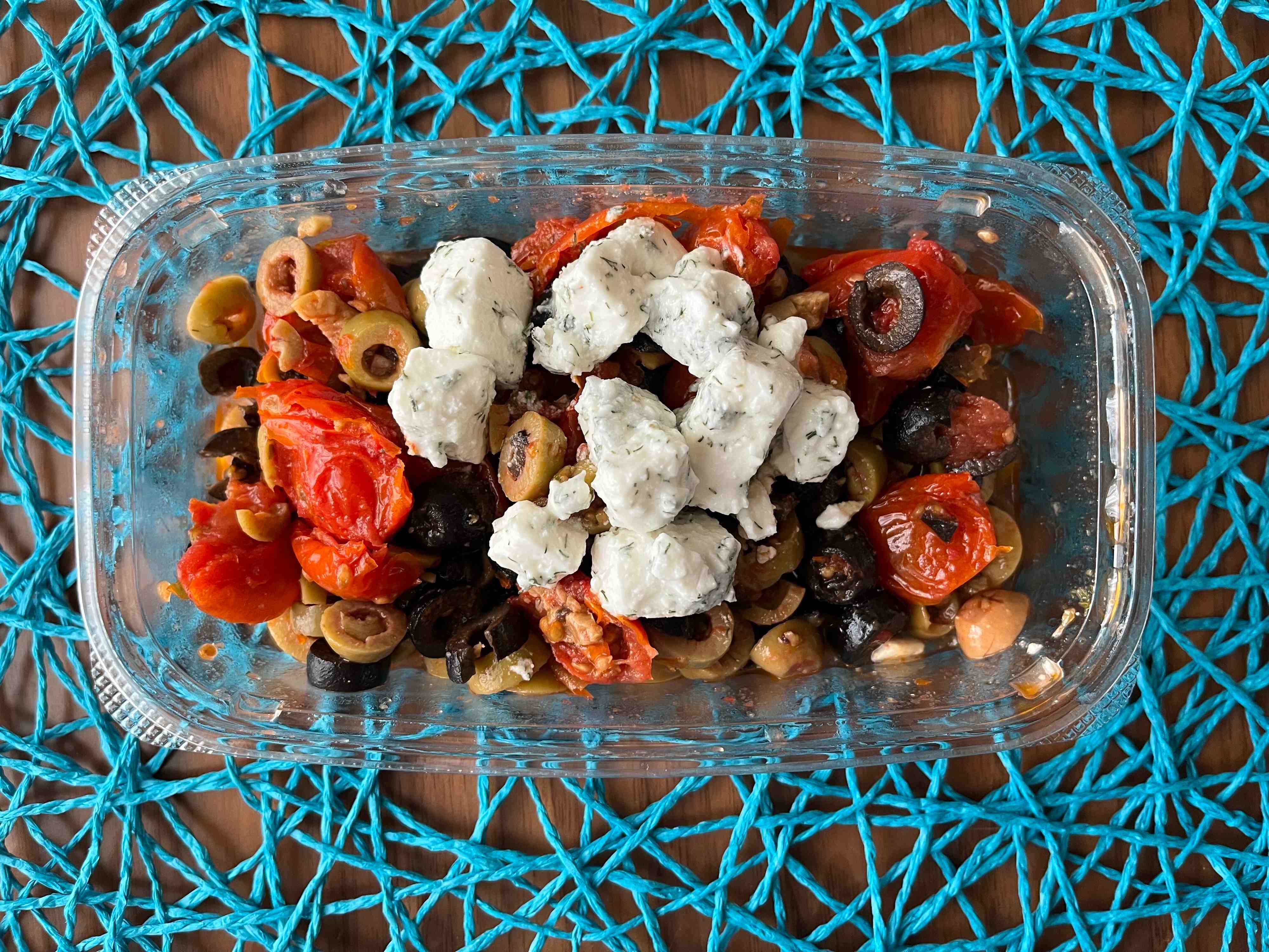 羊や山羊のミルクを原料とした「フェタチーズ」に、セミドライトマト、そしてスライスされたグリーンオリーブとブラックオリーブ。これらが白ワインビネガーベースの液でマリネされています。