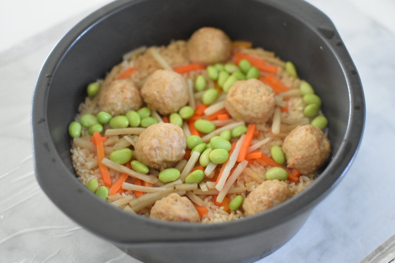 1.洗米したお米にめんつゆを加え、2合分の水をセットし、にんじんごぼうミックス、むき枝豆、肉団子を並べて通常通りに炊飯する