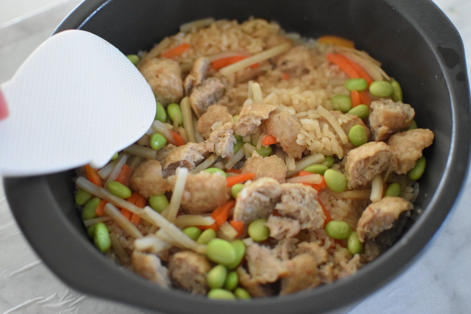 2.炊き上がったら、肉だんごを細かく切るようにして全体によく混ぜ込む