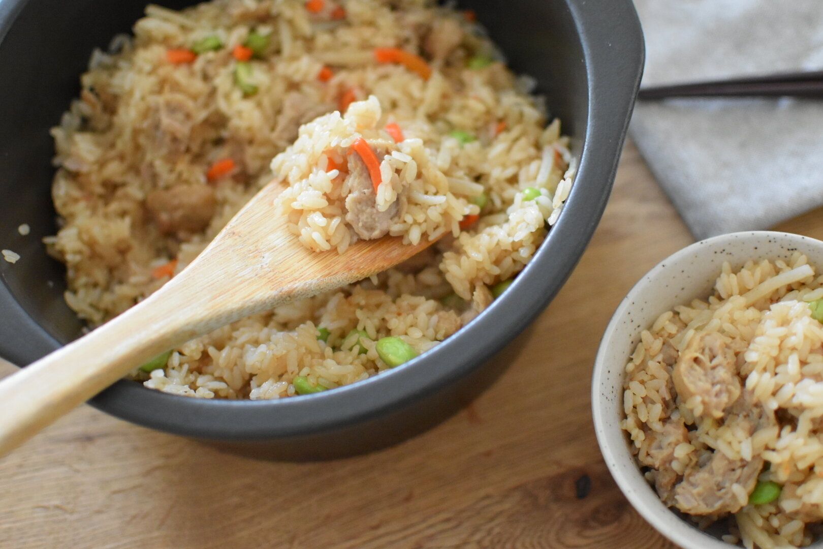 ボリュームたっぷりの炊き込みご飯は、ちょっと物足りなく感じてしまう魚料理がメインの日にもおすすめ。