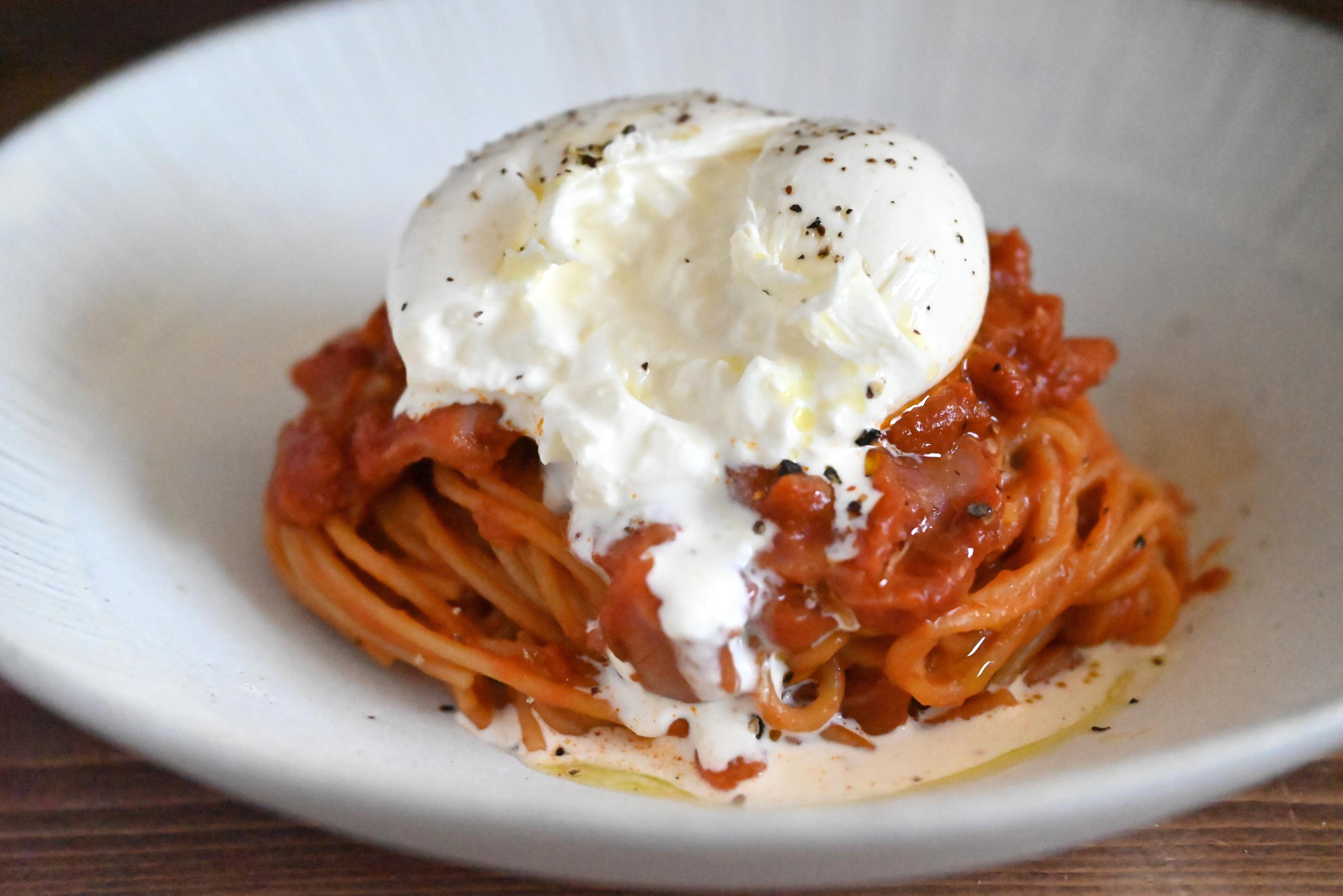 とろけるブラータとパスタが絡み、ただのトマトパスタが濃厚な味わいに!