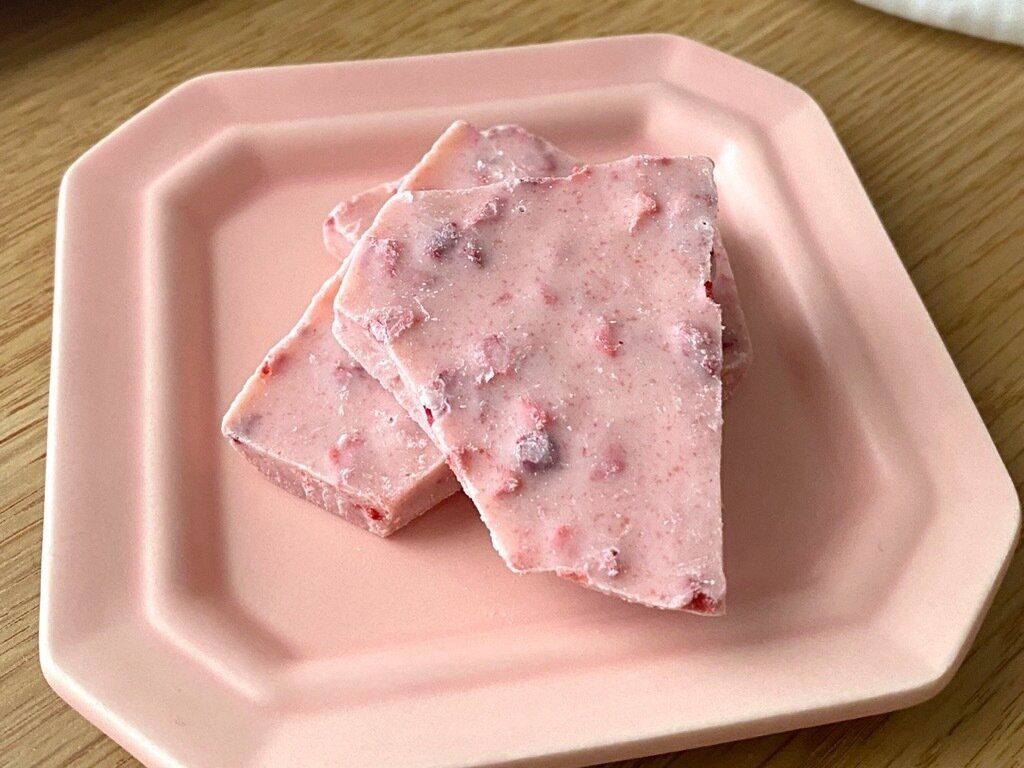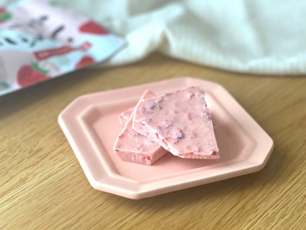 いちご柄の可愛らしいデザインに惹かれ手に取りましたが、実は乾燥いちごや国産いちごパウダーを使用した本格的なチョコレートなんです。国産いちごパウダーを54%も使用したチョコレートは一体どんな味なのでしょう?