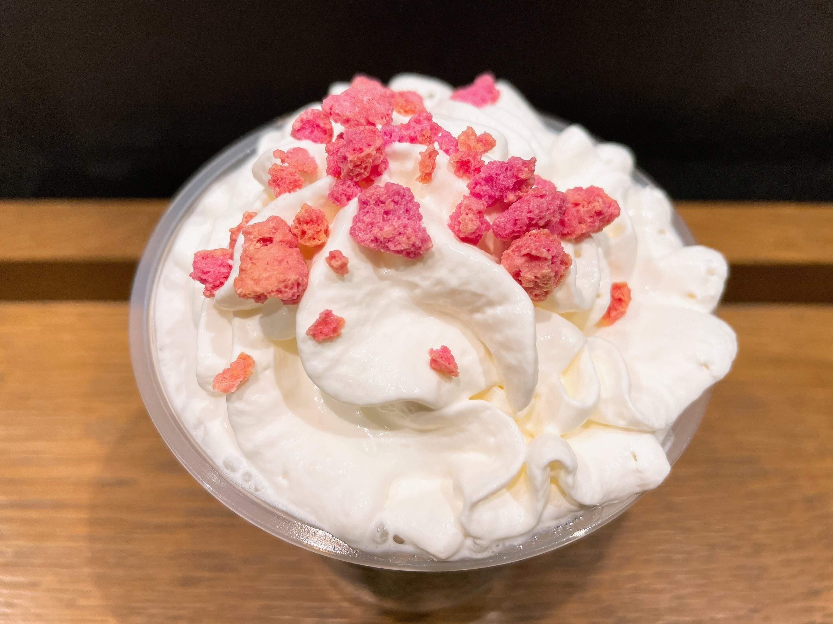 フラペチーノの部分はミルクとさくら風味のパールシュガーでできていてストロベリー風味です。さくら風味はもちろん感じられるのですがストロベリーの方が少し強い感じがしたので強いさくら感が苦手な方でもストロベリー好きな方ならおいしく飲めると思います。