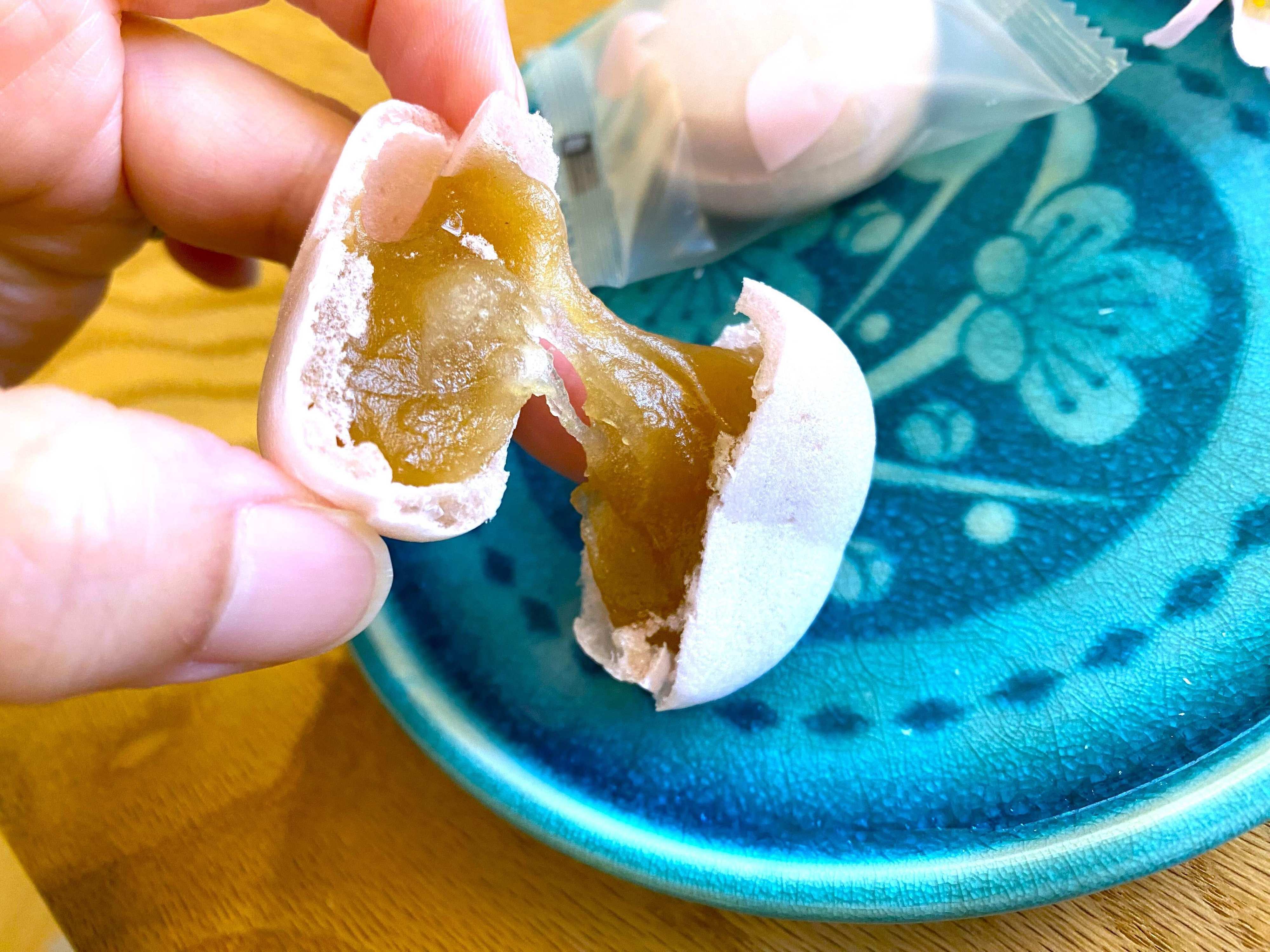 中の餡を見たくて開いてみました。『あれ、お餅は?』お餅らしきものは開いてみても見当たりません。ただ開くときには餡が『みょーん!』と伸びました。