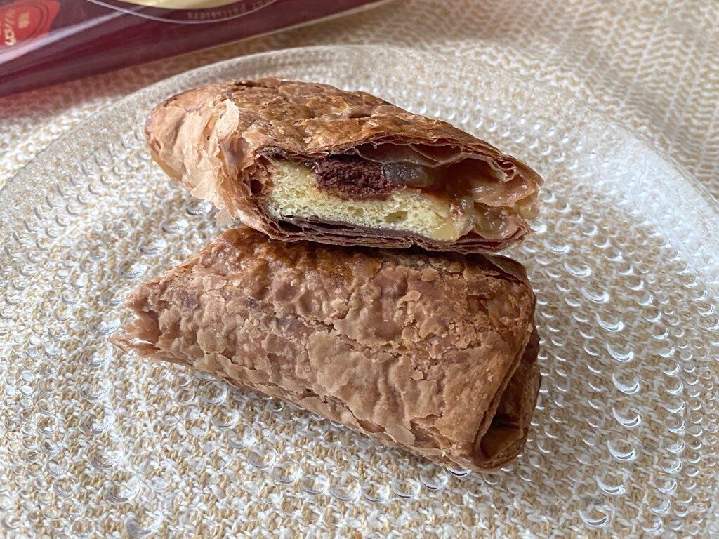 パッケージから取り出すとココア生地のビターな香りがふわりっ。パイ生地はしっとり食感で、ココアのほろ苦さにマーガリンの風味が香ります。中のチョコレートは甘さの中にカカオの風味もあり甘酸っぱいりんごと相性抜群。りんごはシャキシャキと心地よい食感で、パイ生地やチョコレートに負けない存在感。りんごが主役のスイーツという印象です。