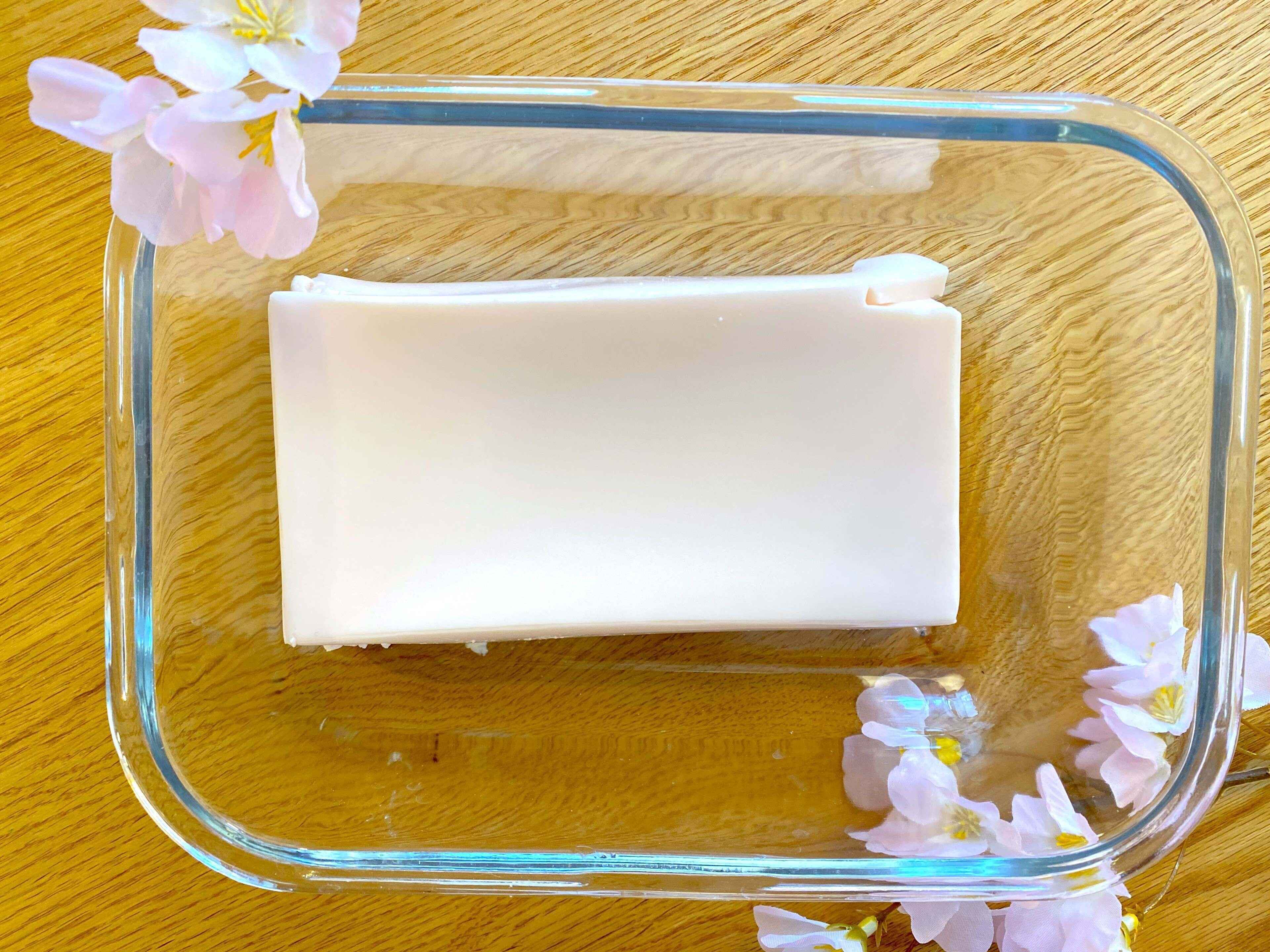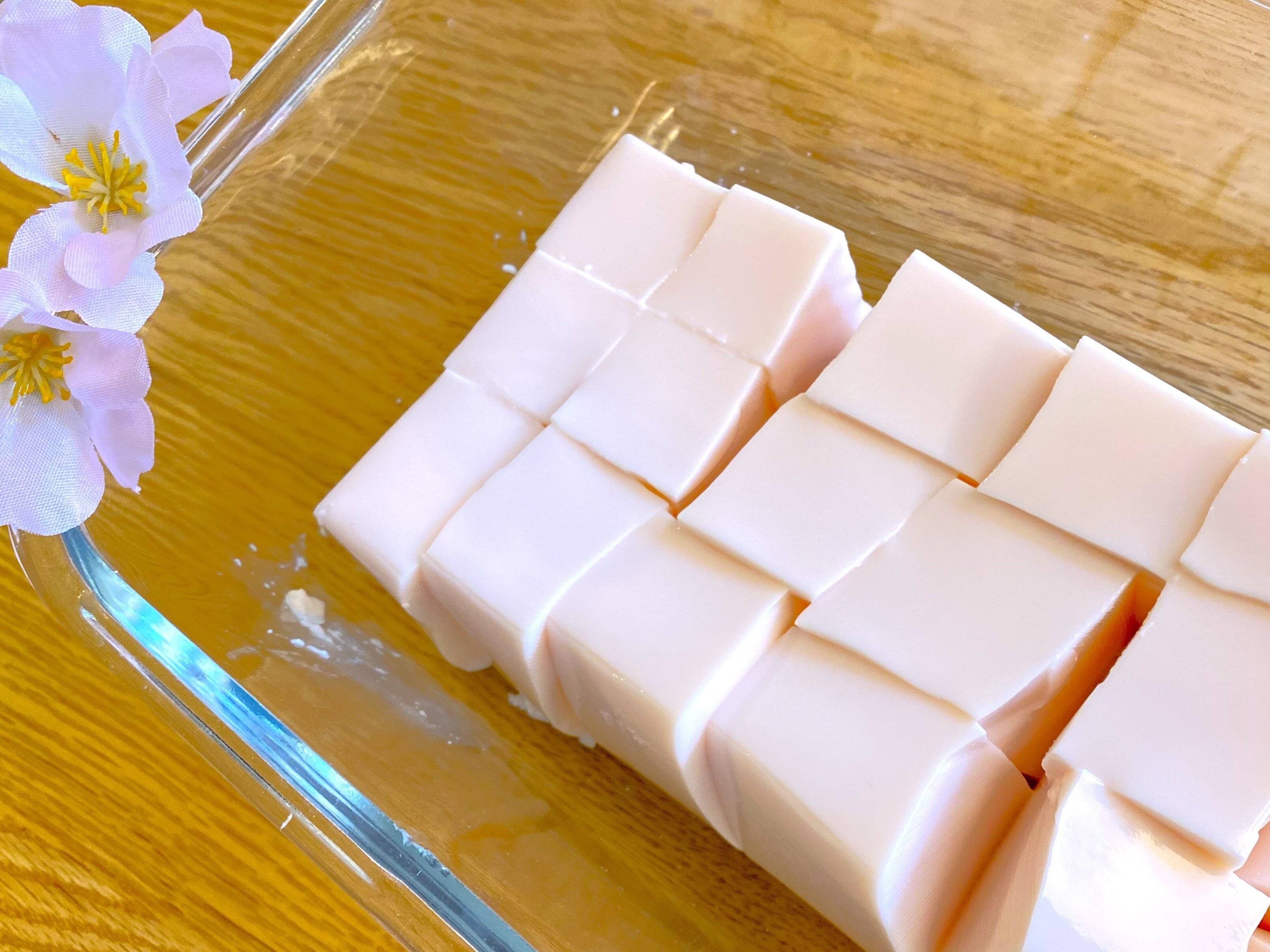 パッケージ上部を開いてハサミで切ると、『つるん!』と淡いピンク色のさくらミルクプリンが出てきます。大きく深さがあるお皿に出すと飛びだす事が無いので安心です。