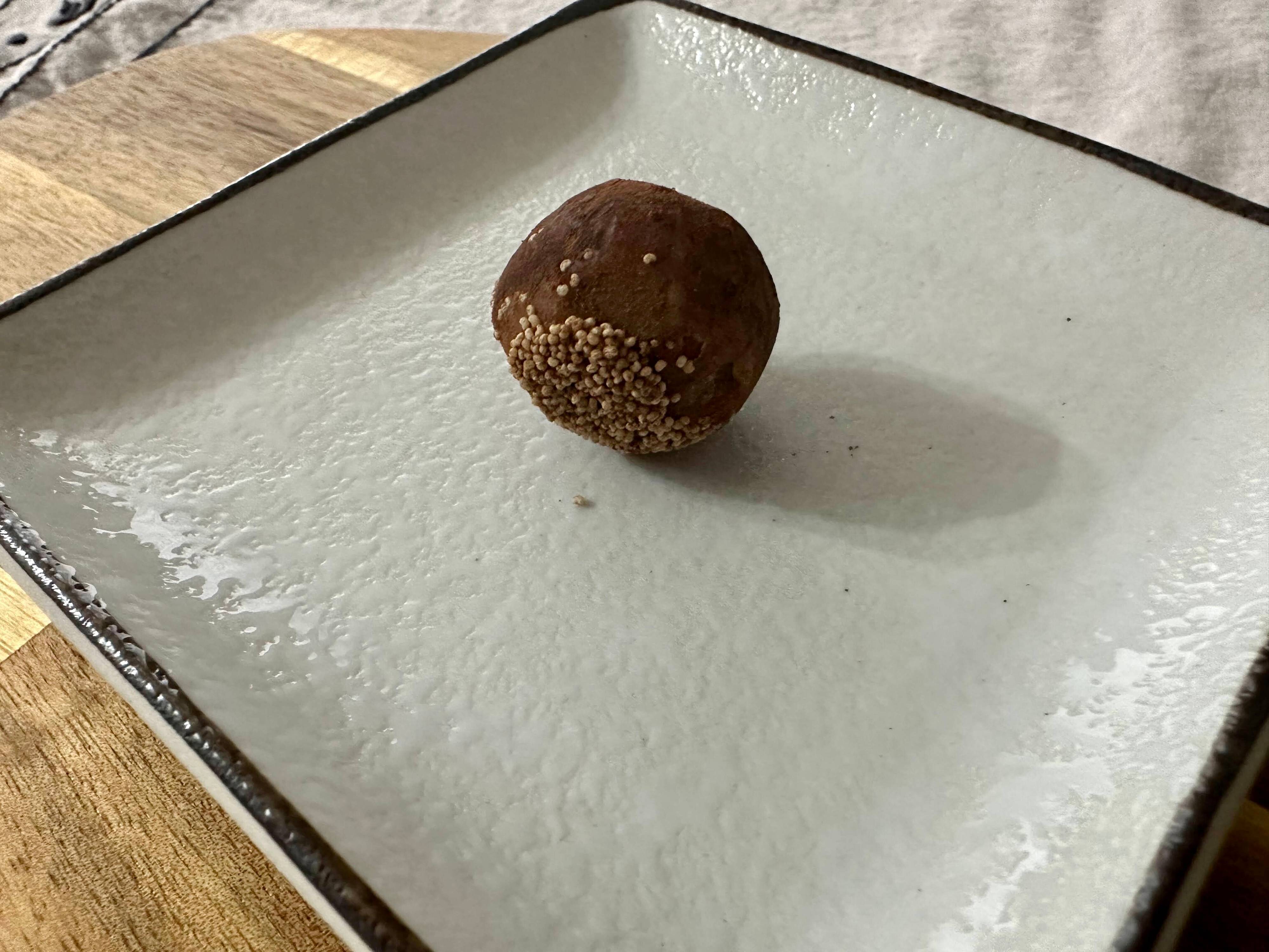1粒出してみると見た目が想像以上に栗で驚きました。栗に似せるため、チョコレートの底面にはケシの実がまぶしてあるこだわりよう。