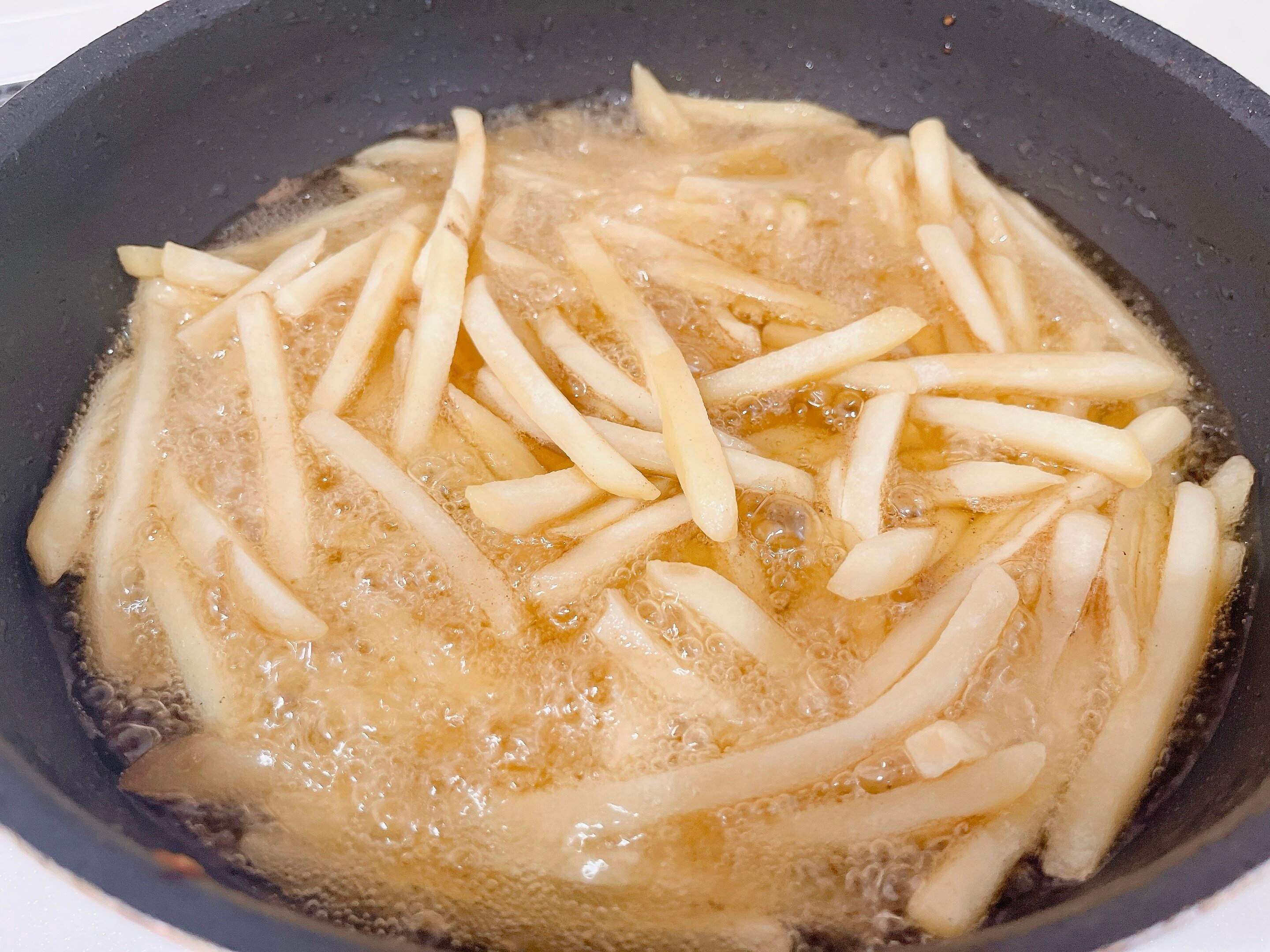 2.凍ったままのポテトを入れきつね色になるまで約2分半揚げたら出来上がりです。