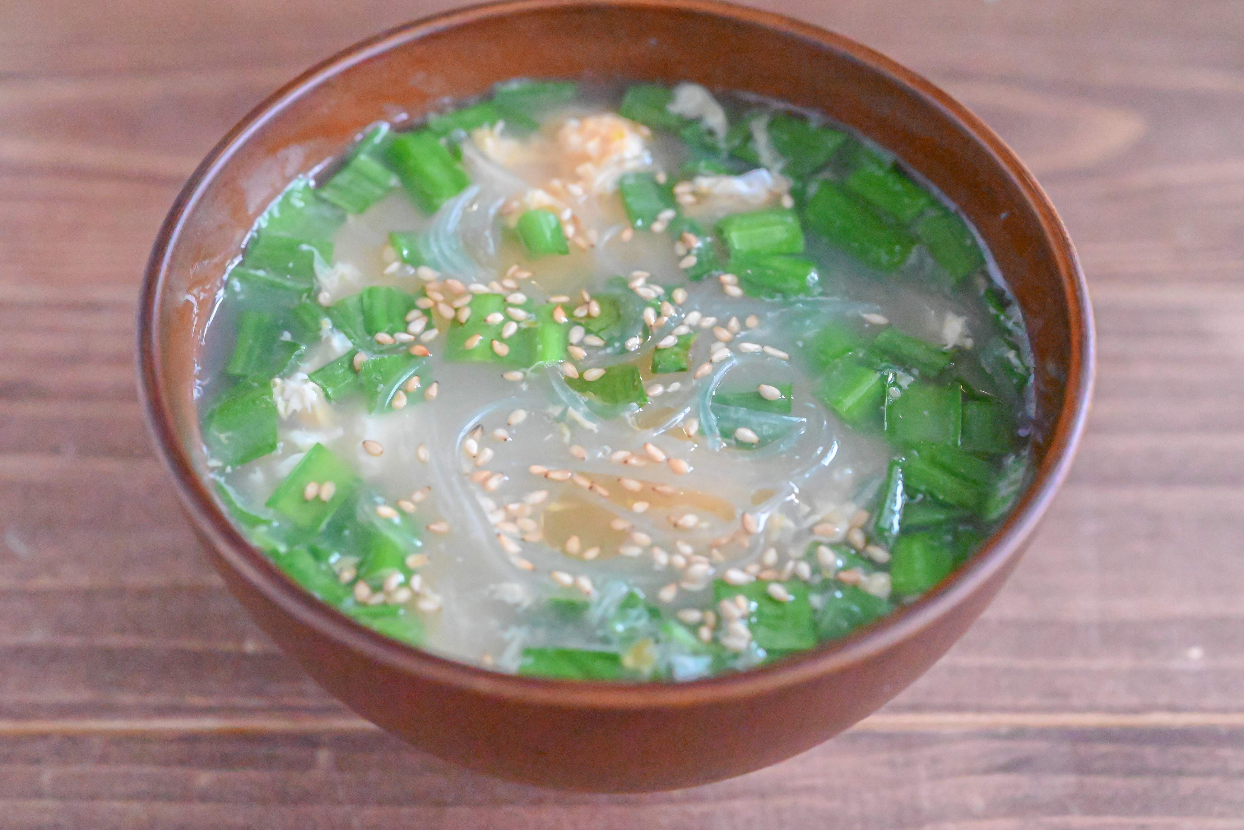 夜食にぴったり♪にらと卵の春雨スープ