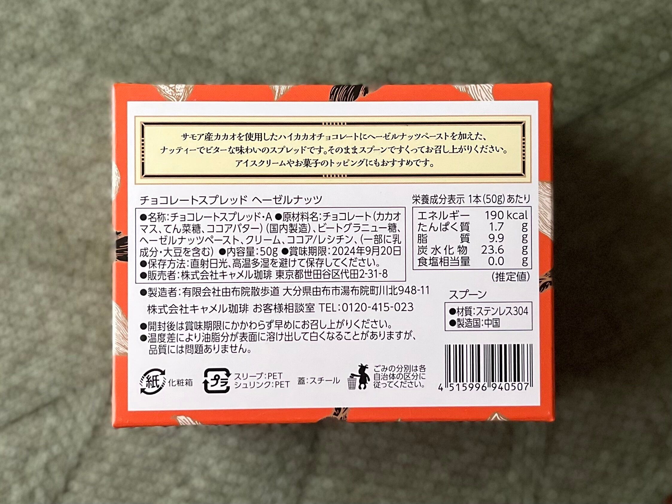 サモア産カカオを使用したハイカカオチョコレートに、ヘーゼルナッツペーストを加えたスプレッドは、一瓶190kcal。一度に食べきってもセーフ…でしょうか?