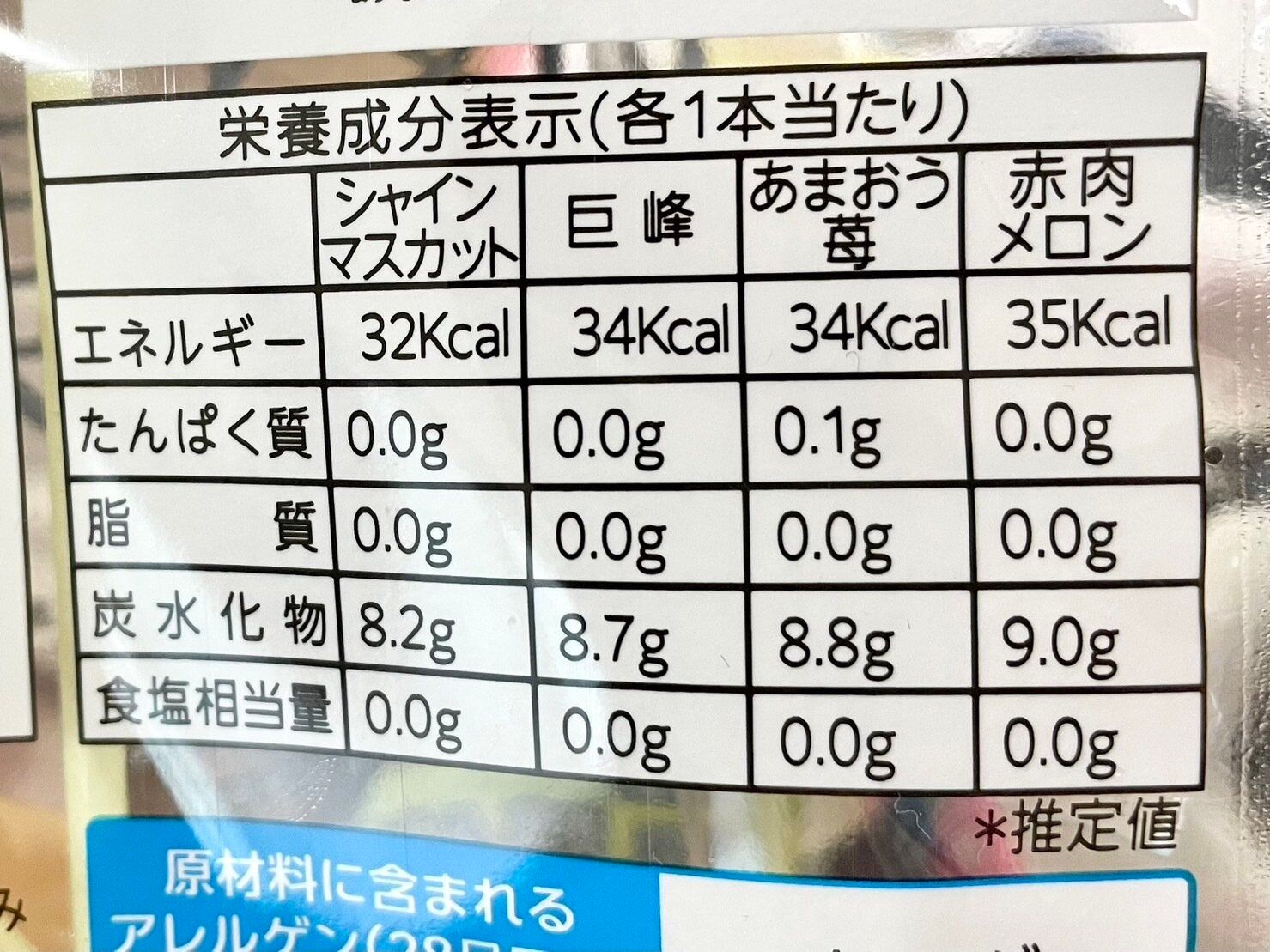 ◆カロリー:シャインマスカット32kcal、巨峰とあまおう苺34kcal、赤肉メロン35kcal