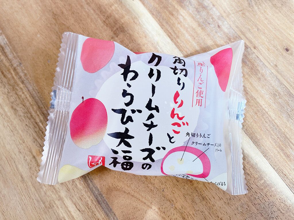角切りりんごとクリームチーズ入りのクリームをぷるぷるのわらび餅で包んだというわらび大福。