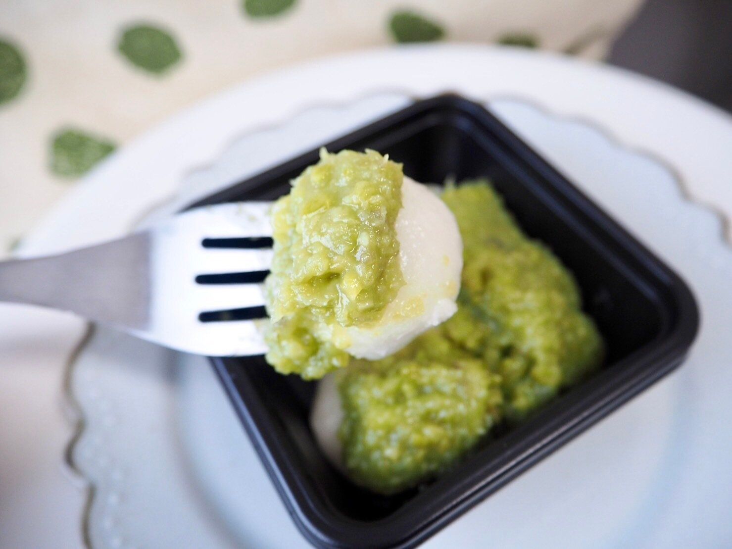 4つの餅の上には、餅の姿がほとんど見えないほど惜しみなくたっぷりとずんだ餡がかかっています。